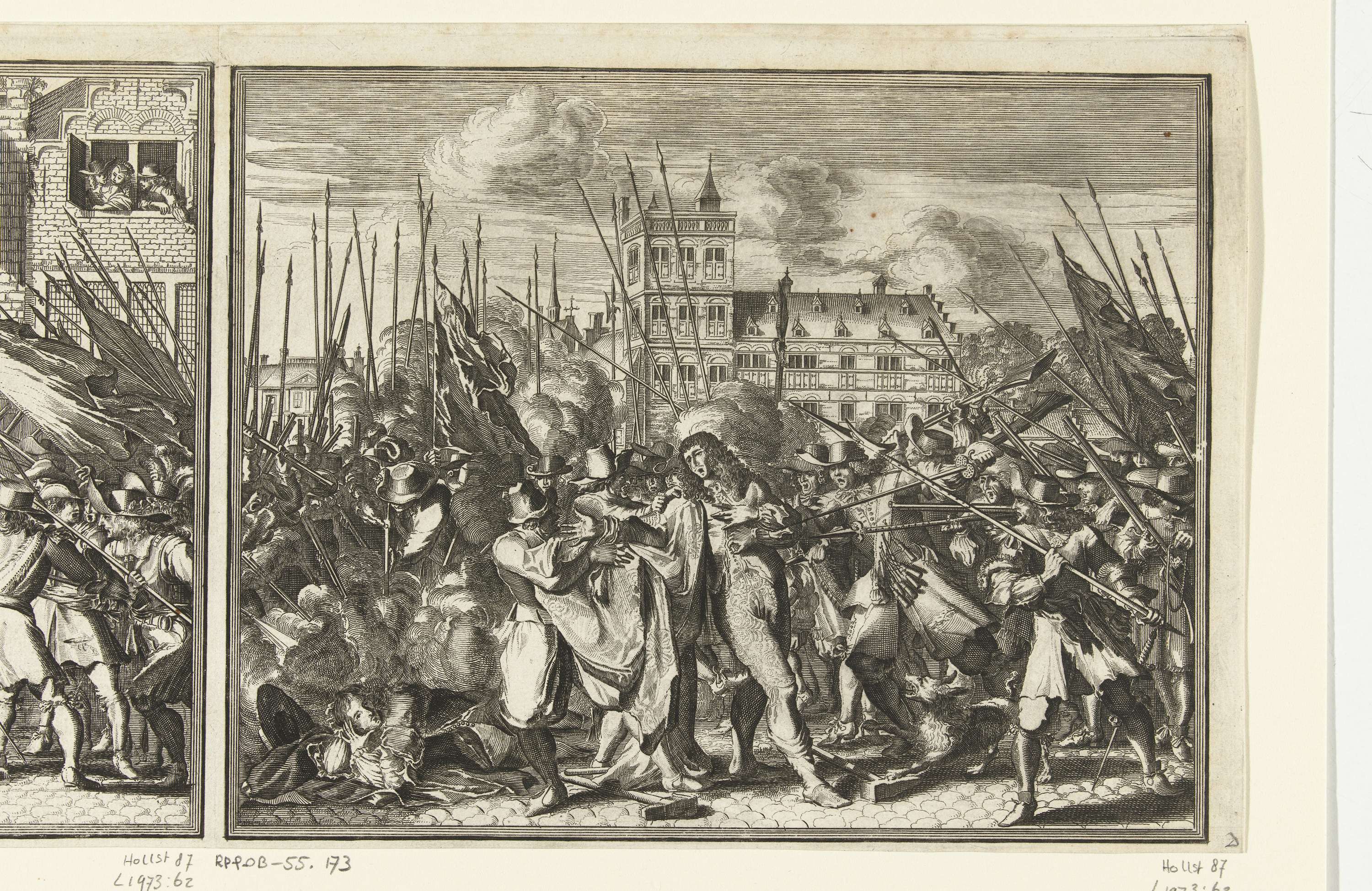 Cornelis de Witt, 1672. Hij wordt van alle kanten belaagd. Johan de Witt is links op de grond gevallen.