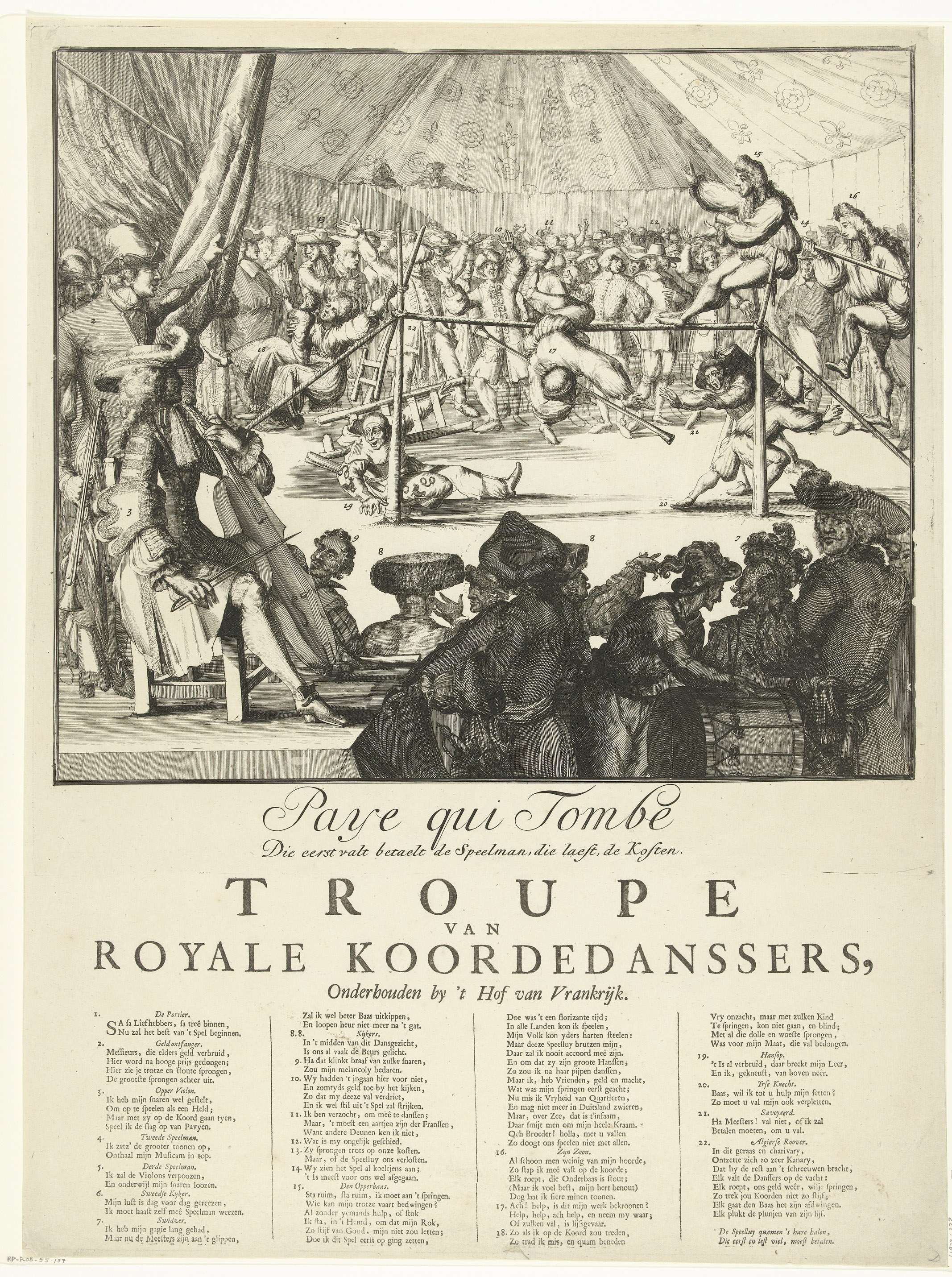 In een circusvoorstelling zien we de inspanningen van de katholieke vorsten om als koorddansers aan de macht te blijven. Deze metafoor geeft hun precaire situatie weer op een manier dat voor het publiek makkelijk te begrijpen is. Koning-stadhouder Willem III speelt de muziek waarop gedanst moet worden. Terwijl de Engelse koning Jacobus II van het ...