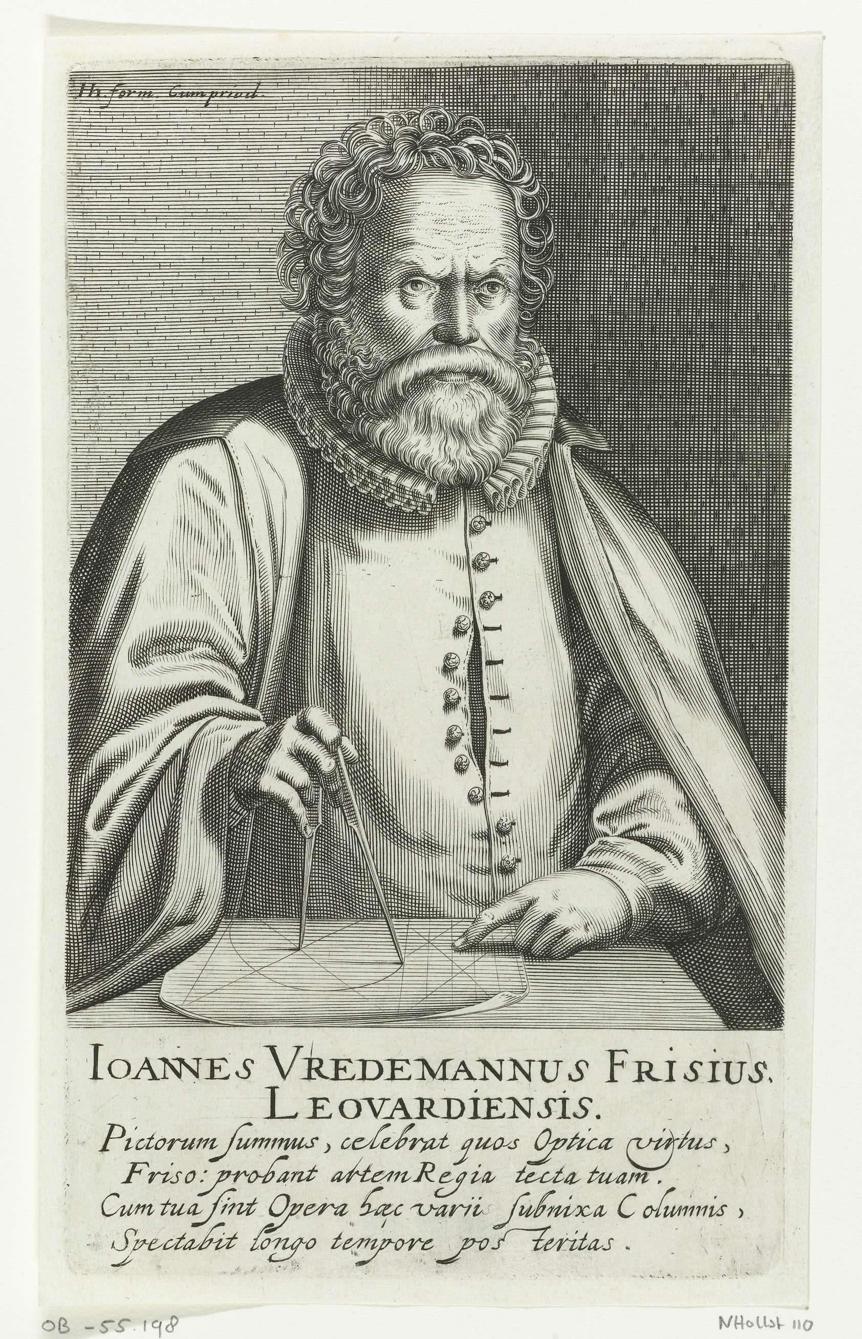 Portret ten halven lijve naar rechts van Hans Vredeman de Vries. Onder het portret zijn naam en vier regels in het Latijn. Prent uit deel 2 van de serie Pictorum Aliquot Celebrium Praecipuae Germaniae Inferioris Effigies. Serie van 72 kunstenaarsportretten vervaardigd door Hendrick Hondius I, Simon Frisius, Andries Jacobsz. Stock en Robert de Baudous.