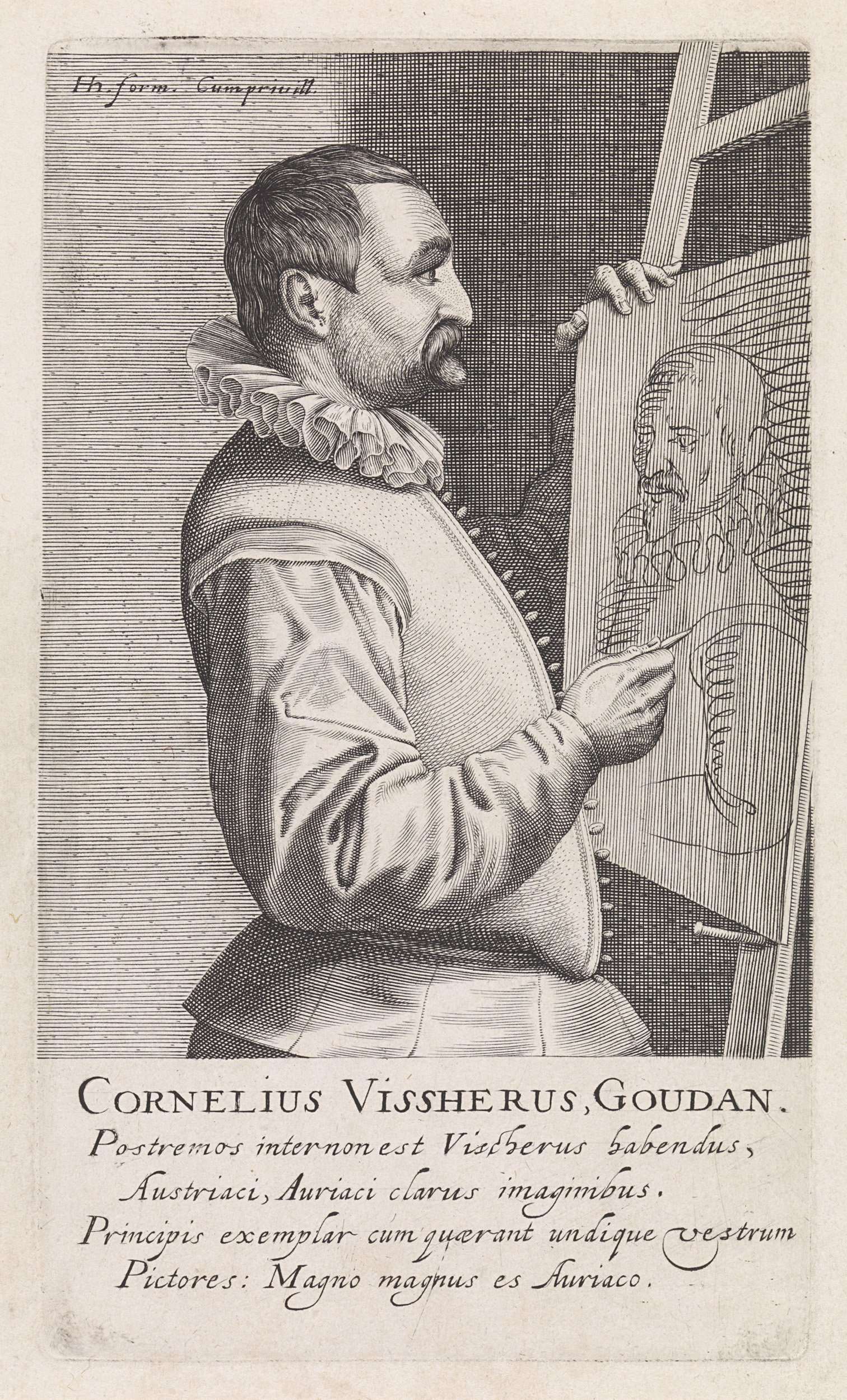 Portret ten halven lijve naar rechts van Cornelis Visscher. Onder het portret zijn naam en vier regels in het Latijn. Prent uit deel 2 van de serie Pictorum Aliquot Celebrium Praecipuae Germaniae Inferioris Effigies. Serie van 72 kunstenaarsportretten vervaardigd door Hendrick Hondius I, Simon Frisius, Andries Jacobsz. Stock en Robert de Baudous.