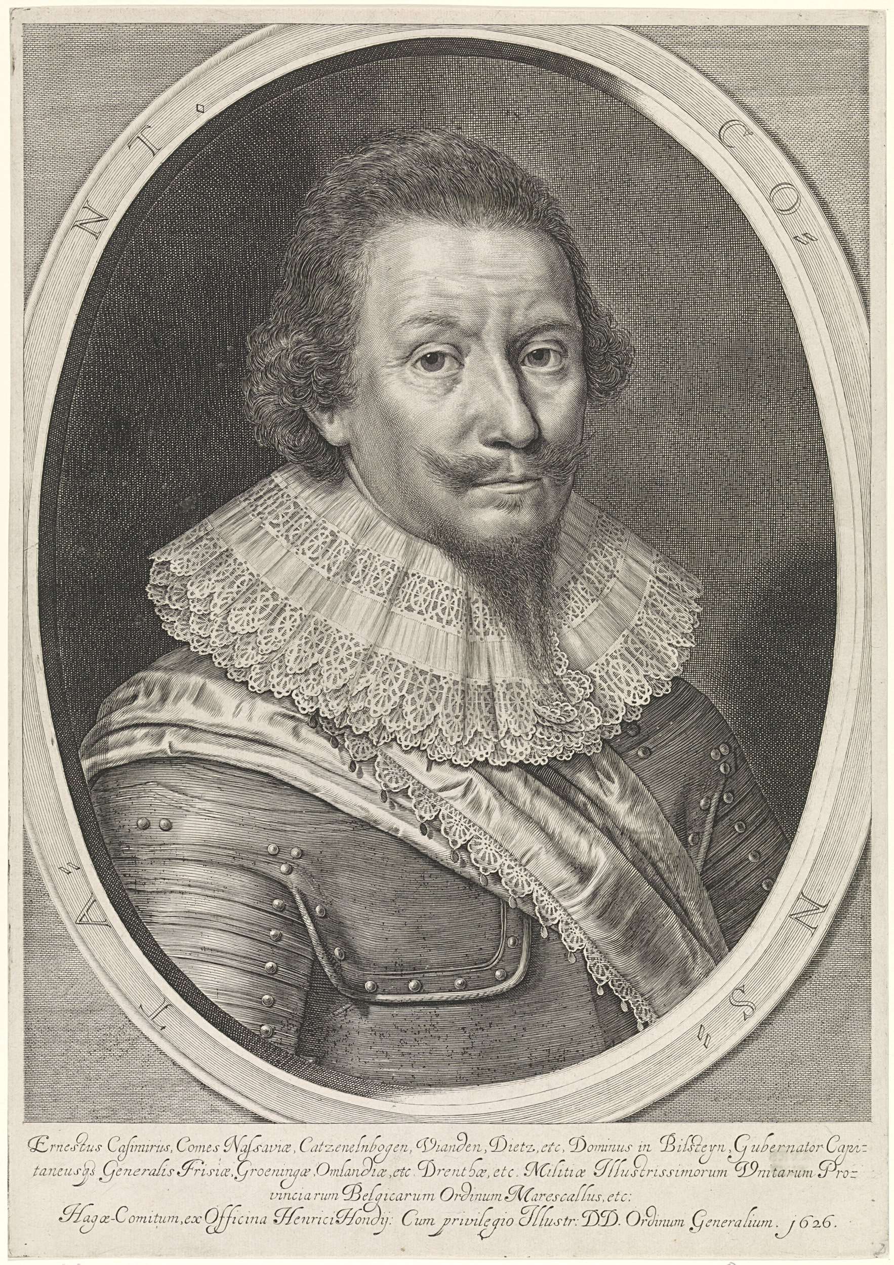 Buste naar rechts van Ernst Casimir, graaf van Nassau-Dietz in een ovale omlijsting met randschrift in het Latijn. Onder het portret drie regels in het Latijn.