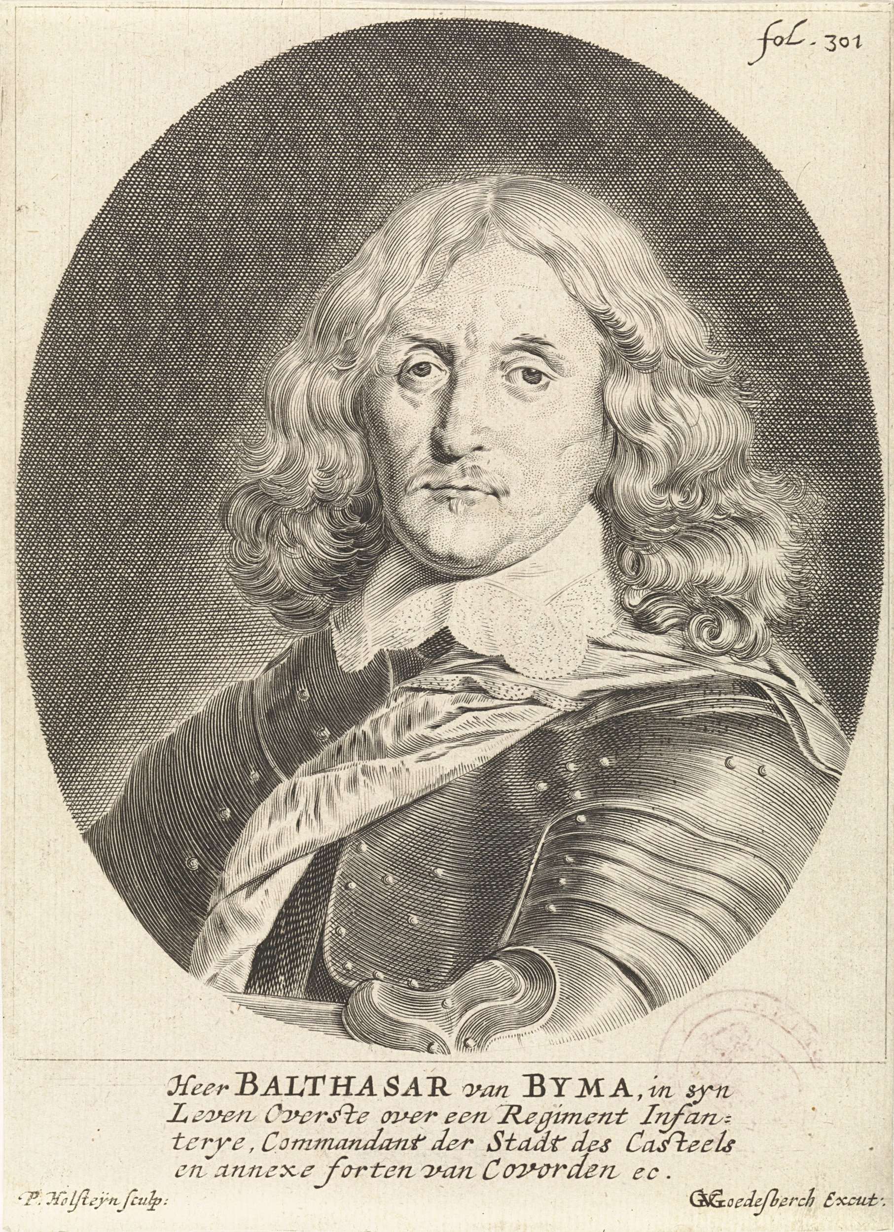 Buste naar links van Balthasar van Bijma in een ovaal. Onder het portret vier regels in het Nederlands. Rechtsboven: fol. 301.