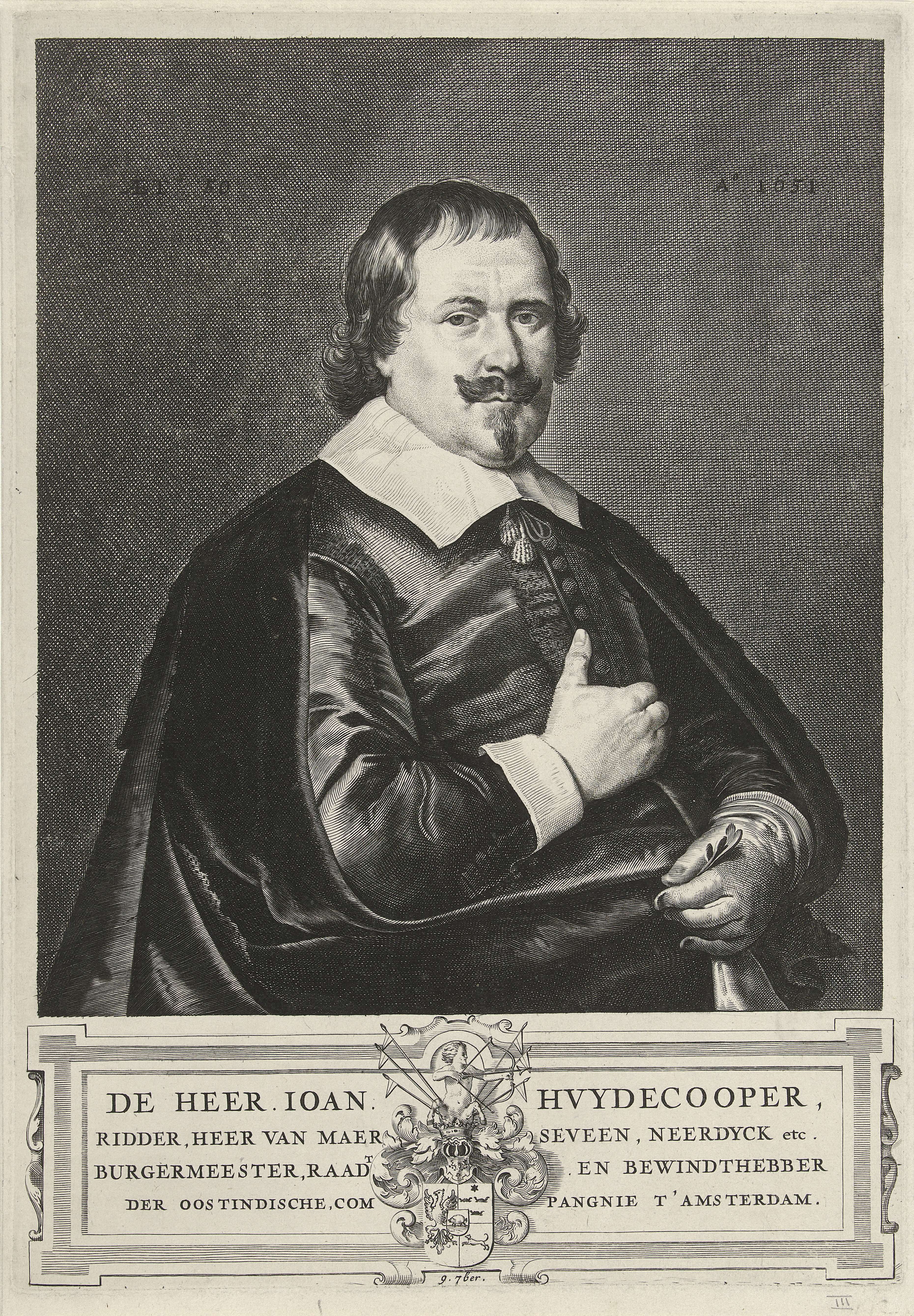 Portret ten halven lijve naar rechts van ridder Joan Huydecoper II, heer van Maarseveen en Neerdijk op 50-jarige leeftijd. Onder het portret zijn wapen en vier regels in het Nederlands op een cartouche.