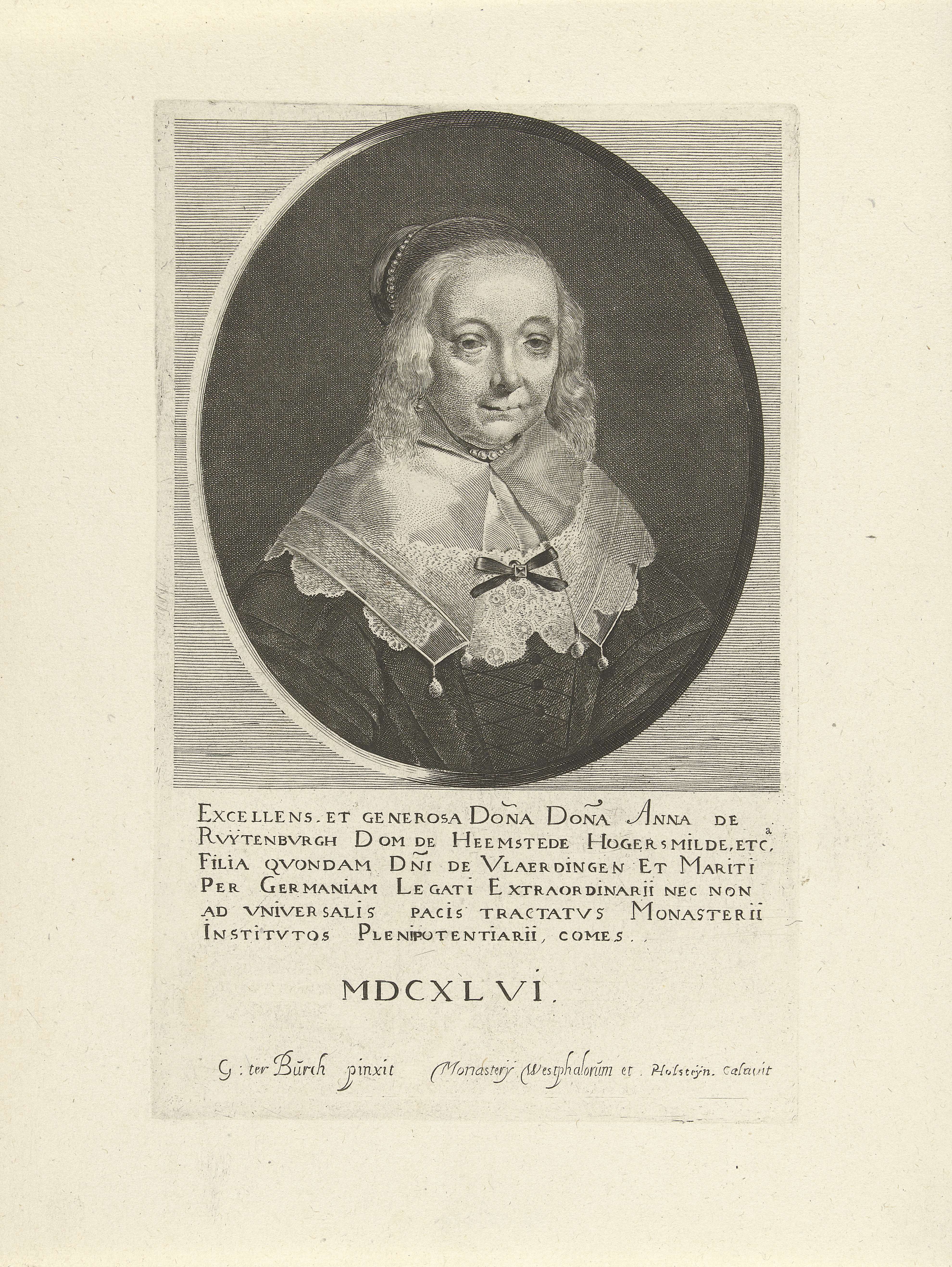 Portret naar rechts van Anna van Ruytenburgh in een ovaal. Onder het portret zes regels in het Latijn.