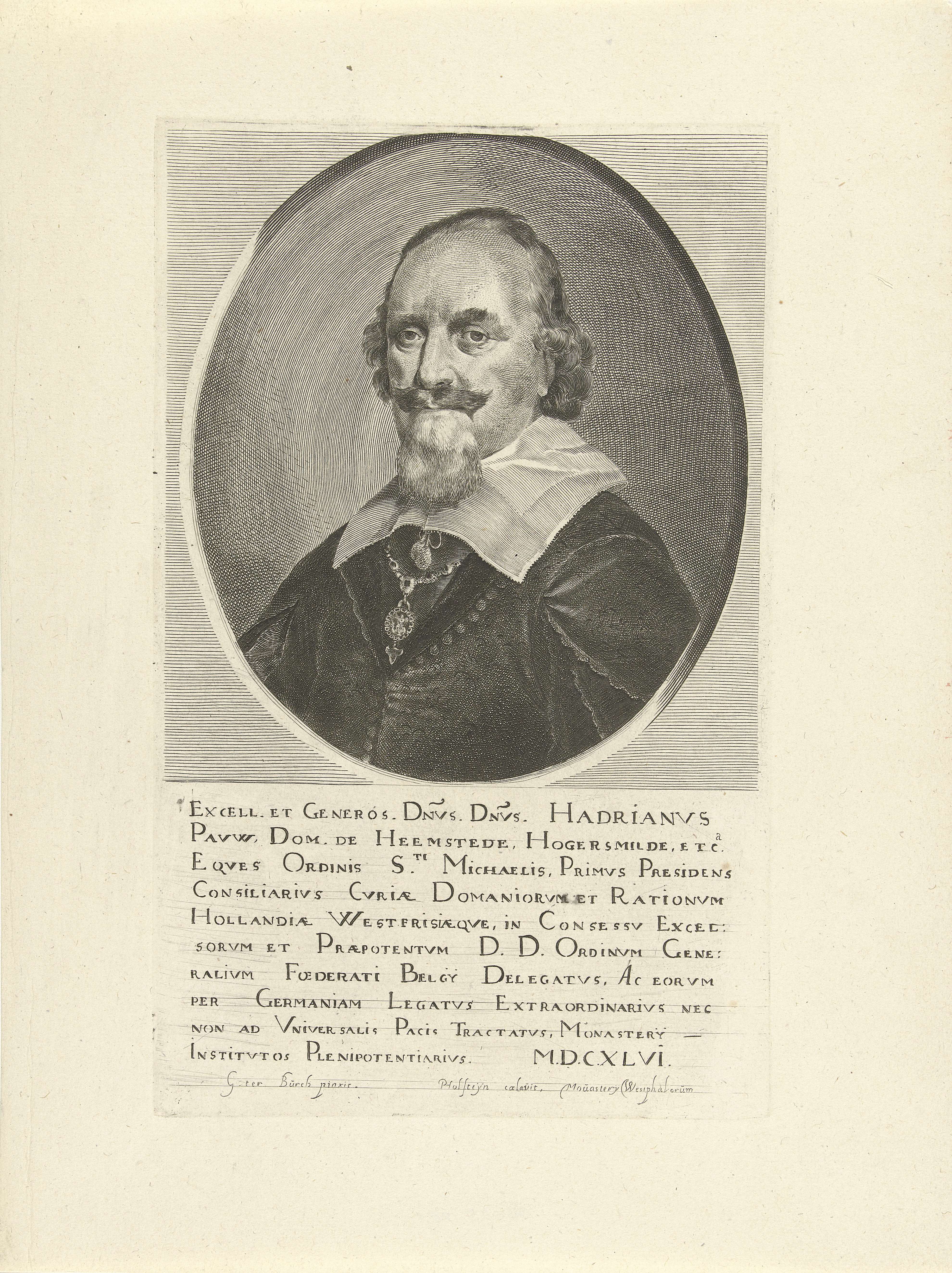 Portret naar links van Adriaen Pauw in een ovaal. Onder het portret tien regels in het Latijn.