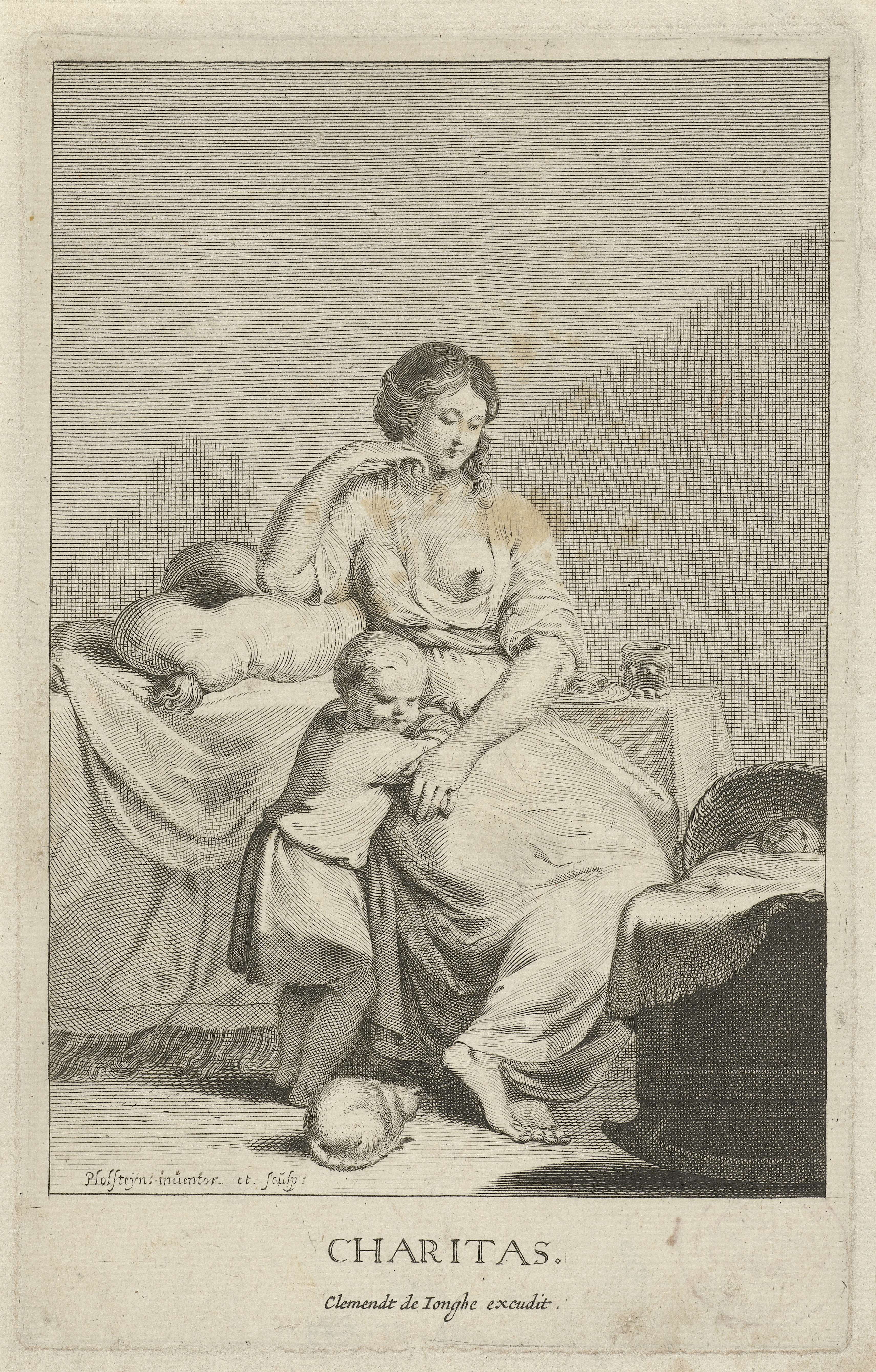 Een vrouw met onblote borst met een kind bij een wieg waarin een slapende baby, als personificatie van de liefde (caritas).