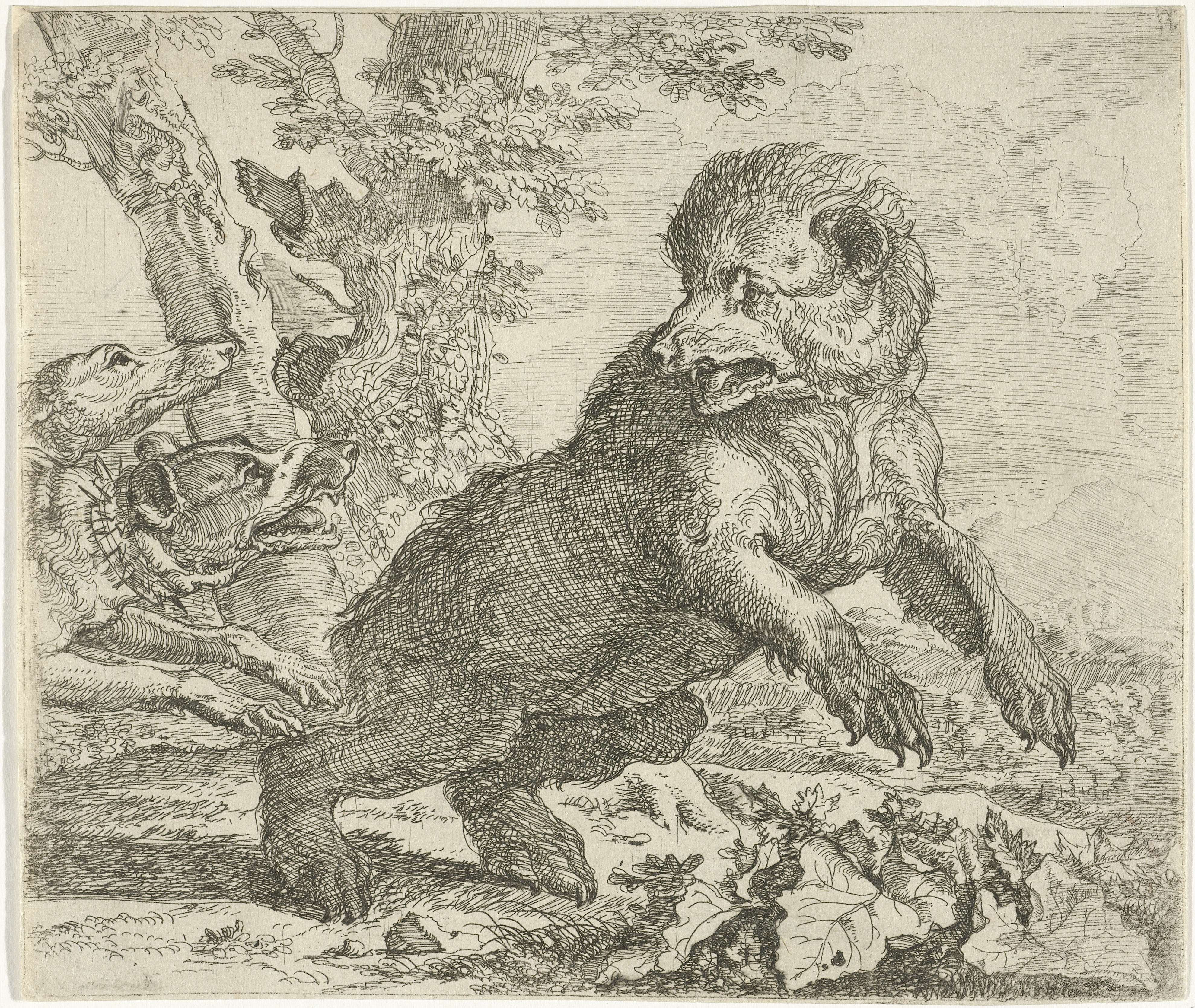 Een beer wordt aangevallen door twee honden. Een luipaard valt een stier aan. Prent uit een serie prenten met jagende dieren.