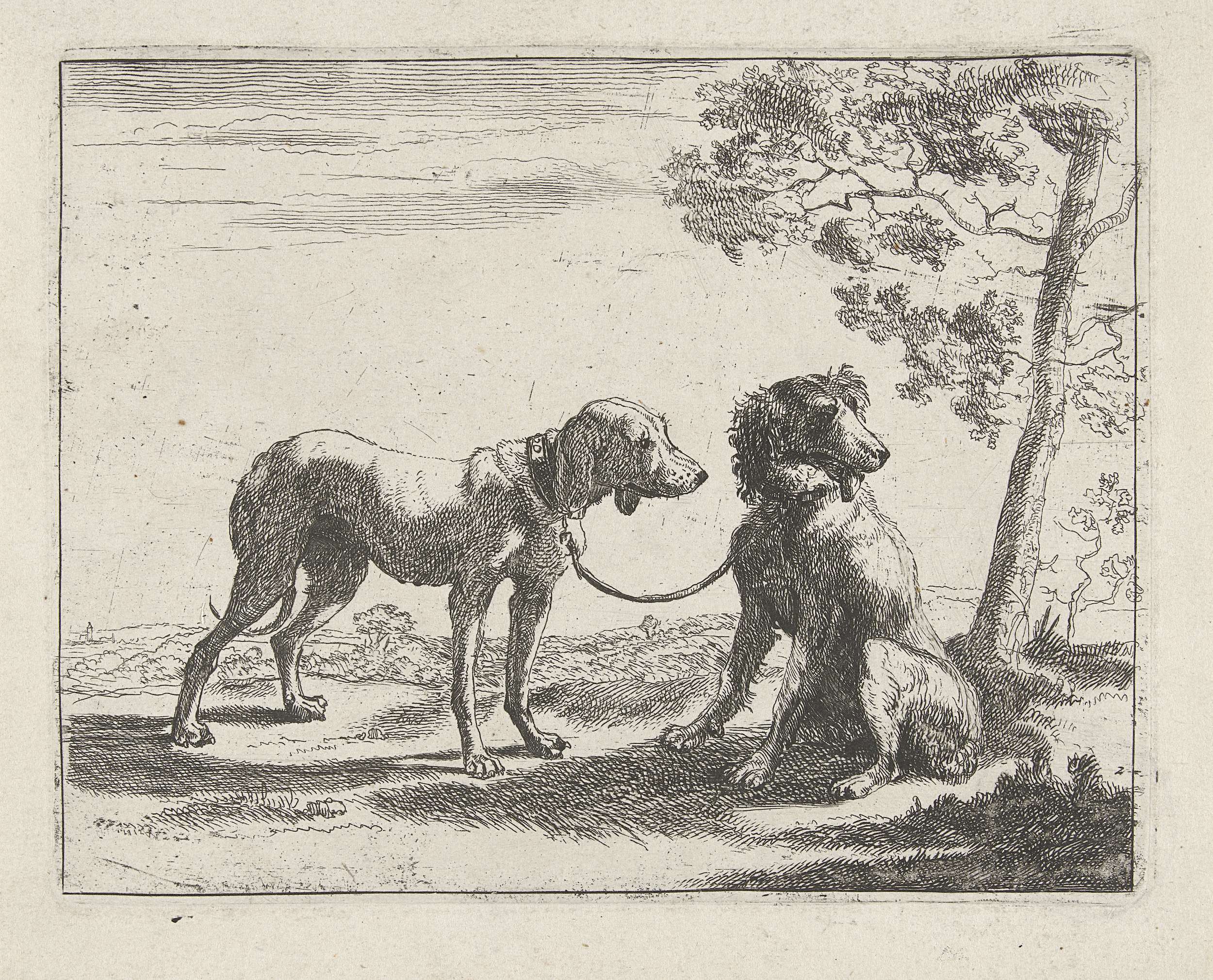 Twee aan elkaar gebonden honden in een landschap. Tweede prent van een serie van acht prenten met voorstellingen van honden.