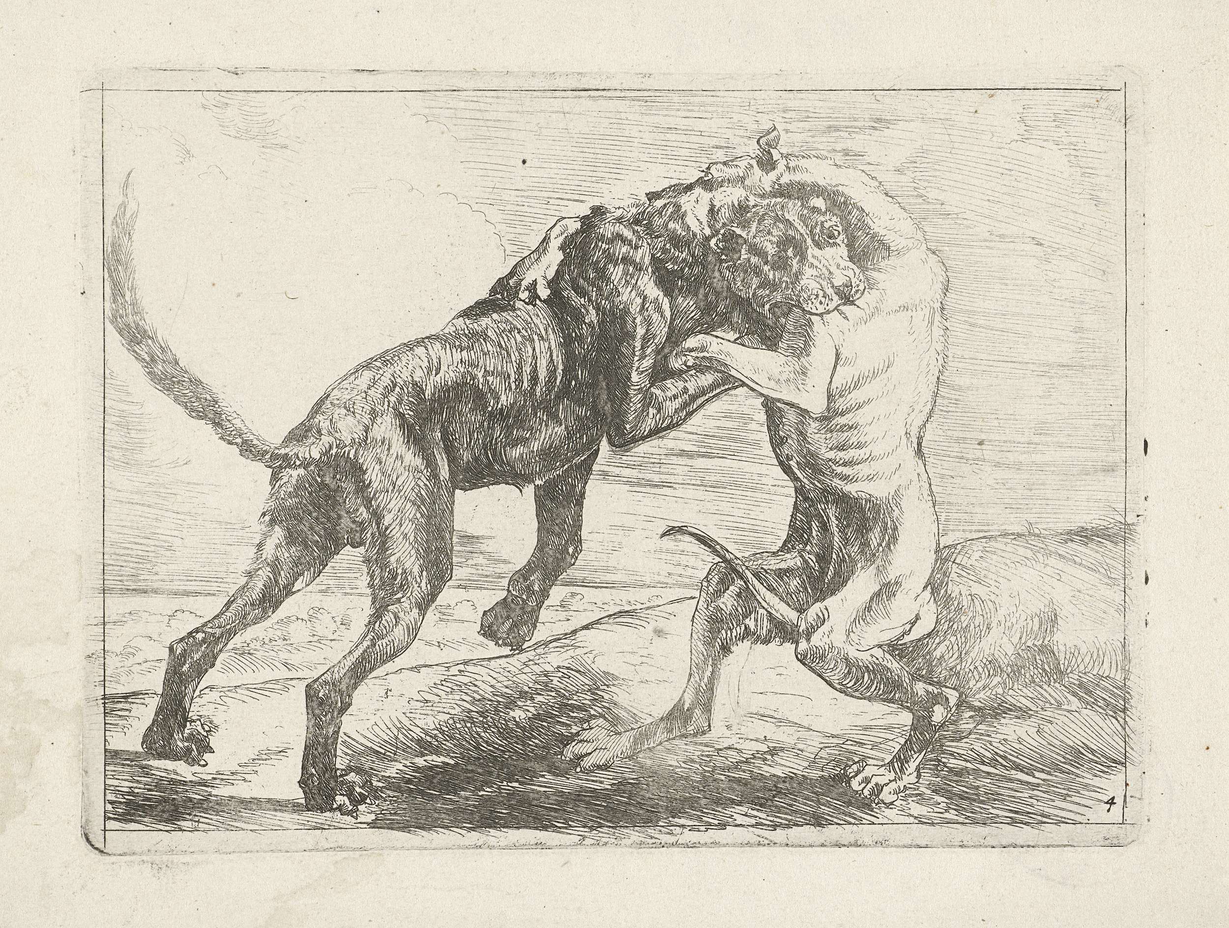 Twee vechtende honden in een landschap. Vierde prent van een serie van acht prenten met voorstellingen van honden.