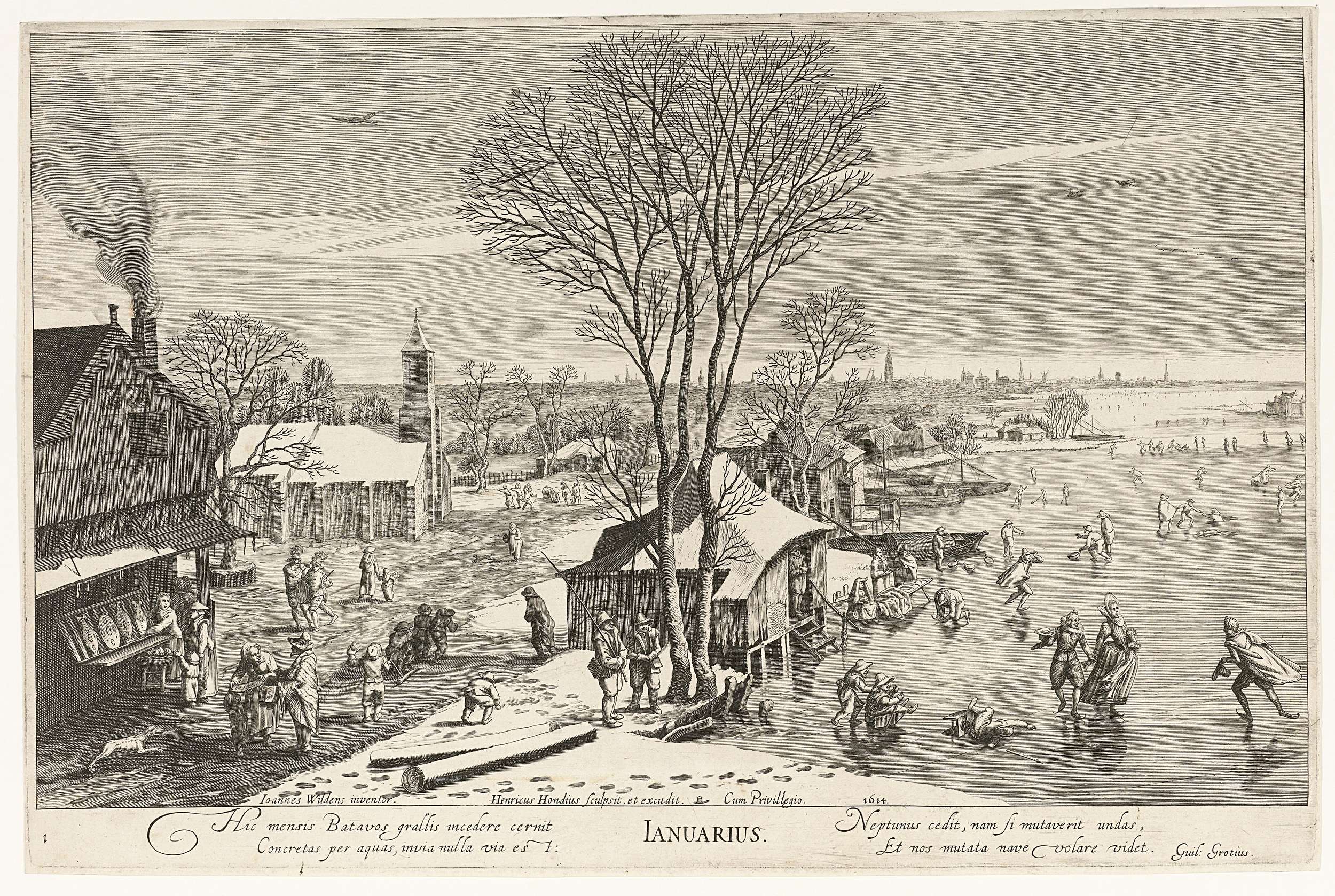Winterlandschap met ijsgezicht en enkele boerenhuizen. Op het ijs, rechts, wordt geschaatst. Links op de voorgrond een winkel waar koek (?) wordt verkocht. Linksachter een kerk. Onderaan (tussen excudit en Cum) de boraxbus als Hondius persoonlijke signatuur. Onder de voorstelling een tekst in het Latijn. Prent uit een serie van de twaalf maanden.