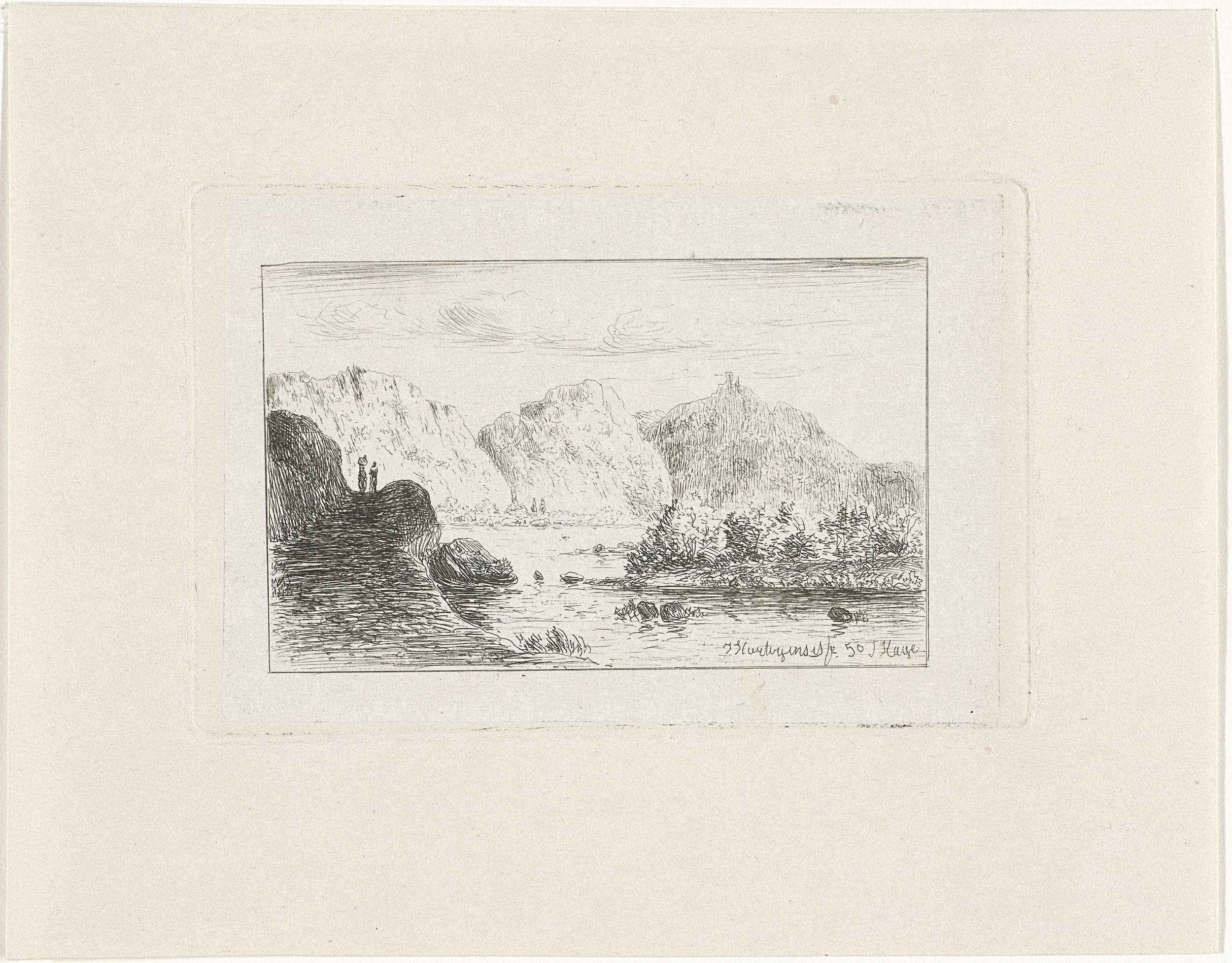 Een bergachtig landschap met een rivier, met links op de voorgrond twee figuren op een rots. Aan de overzijde van de rivier hoge bergen.
