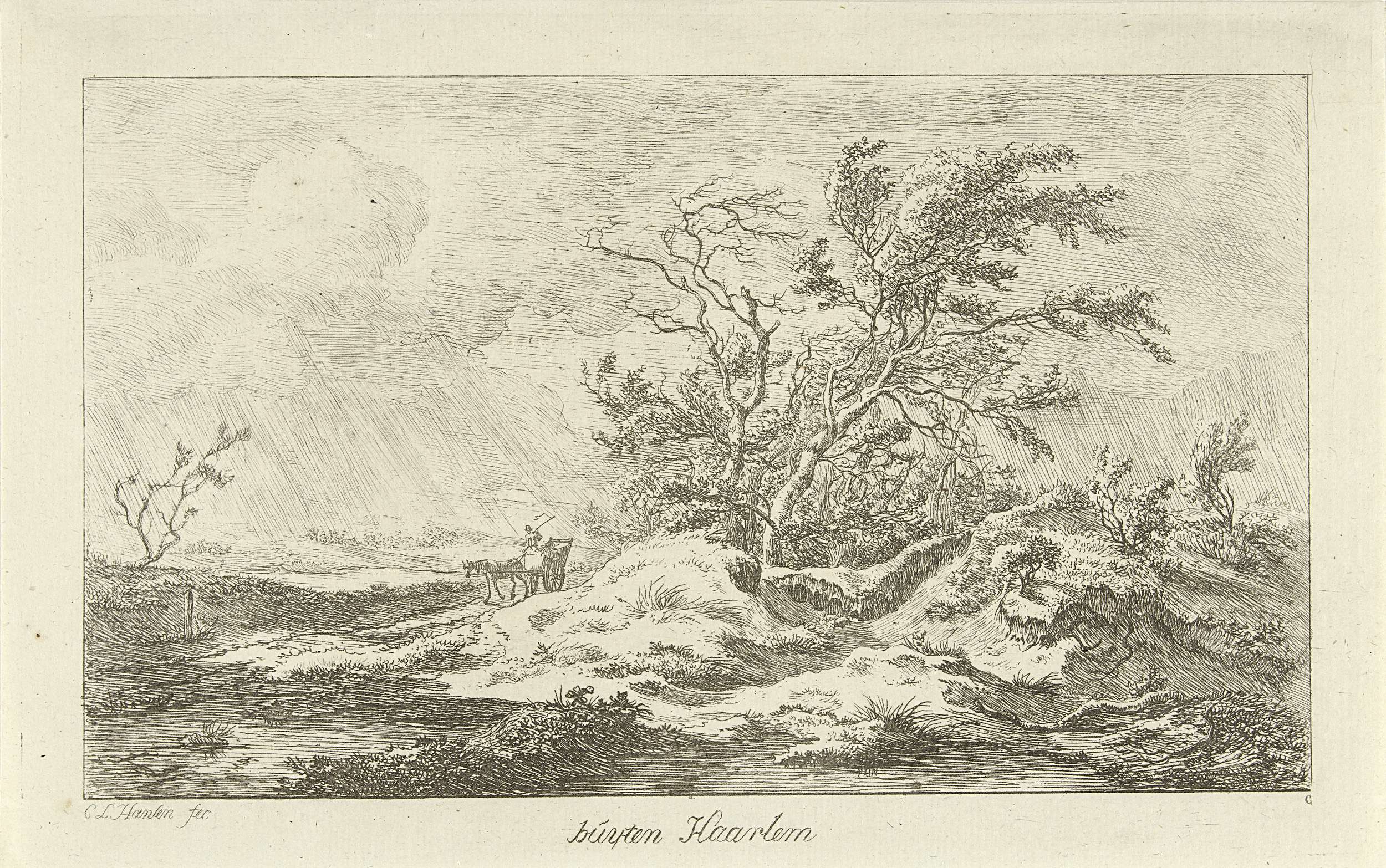 Paard met wagen in een landschap
