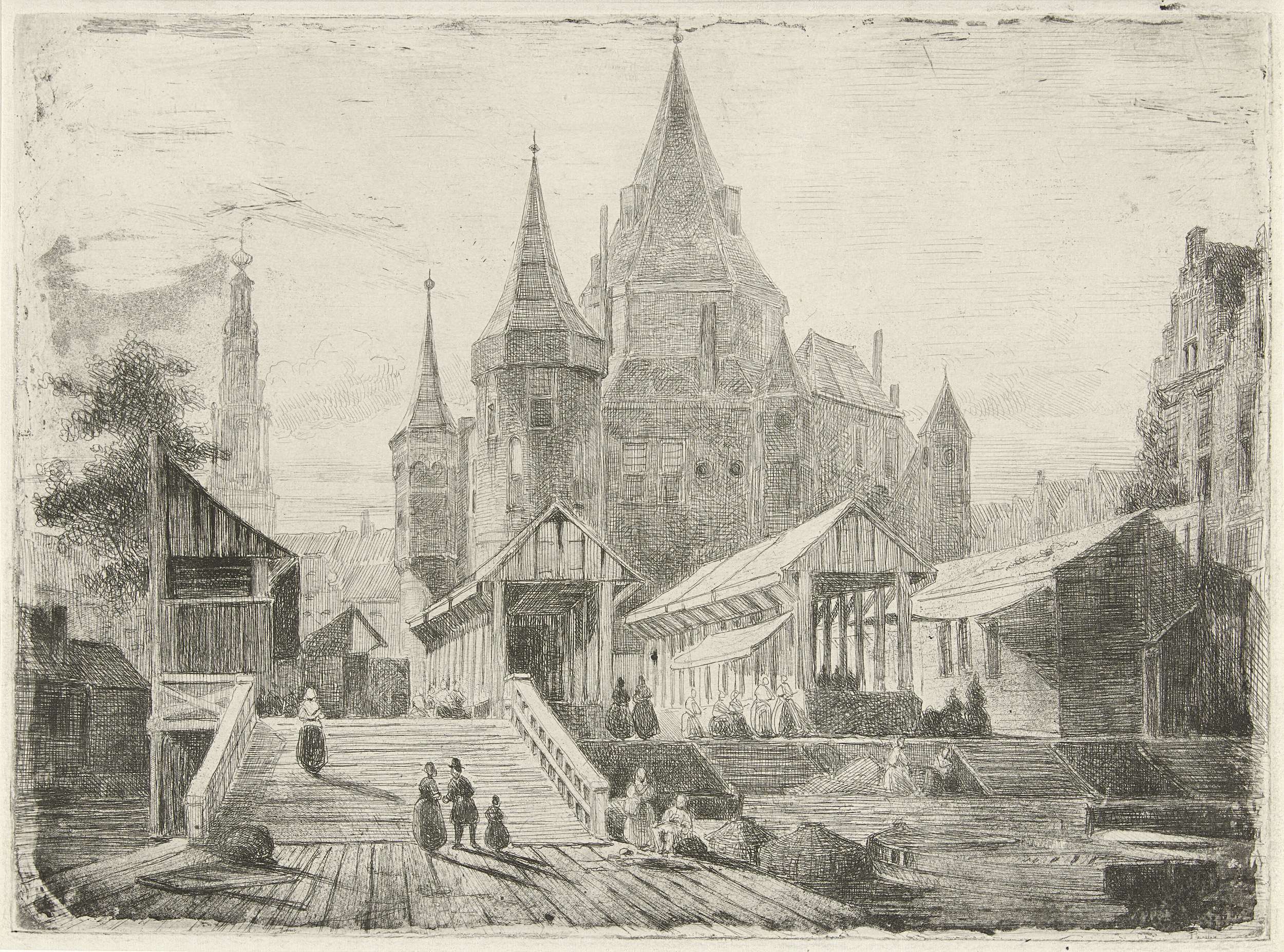 Gezicht op de Nieuwmarkt in Amsterdam, met op de voorgrond figuren bij een houten brug en markthallen, op de achtergrond de Waag of de St. Anthonispoort en de toren van de Zuiderkerk.