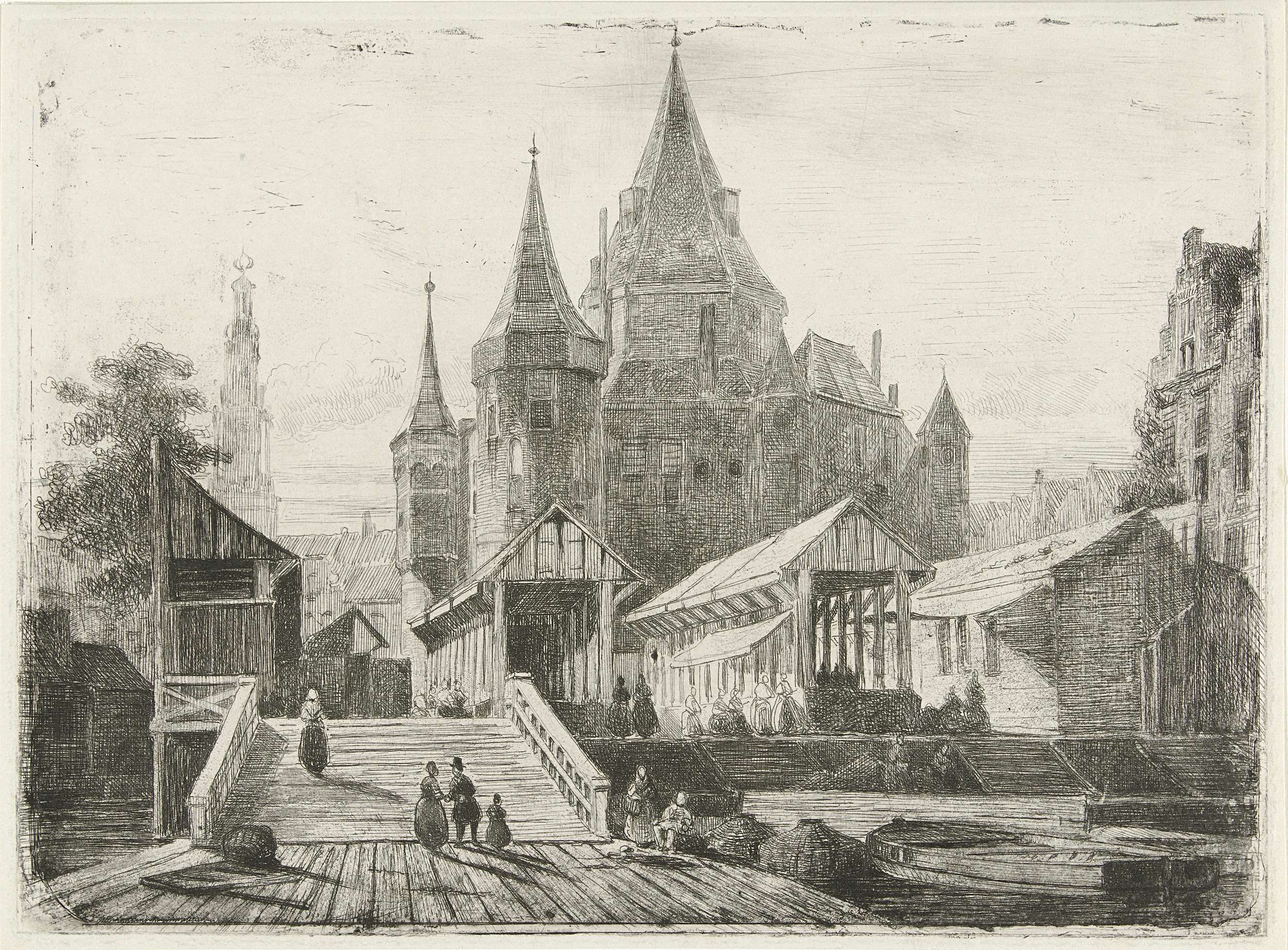 Gezicht op de Nieuwmarkt in Amsterdam, met op de voorgrond figuren bij een houten brug en markthallen, op de achtergrond de Waag of de St. Anthonispoort en de toren van de Zuiderkerk.