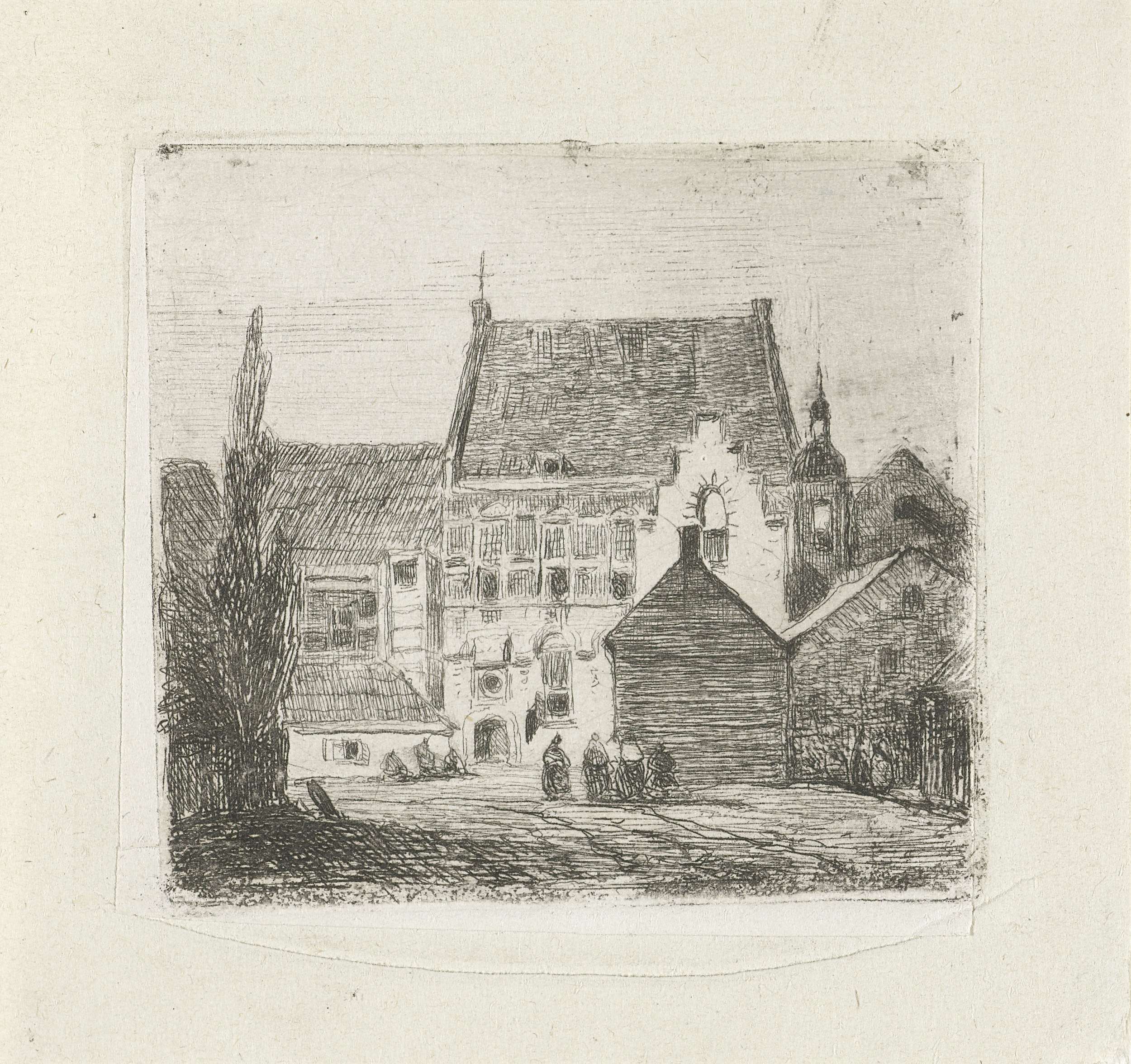 Stadsgezicht met converserende vrouwen