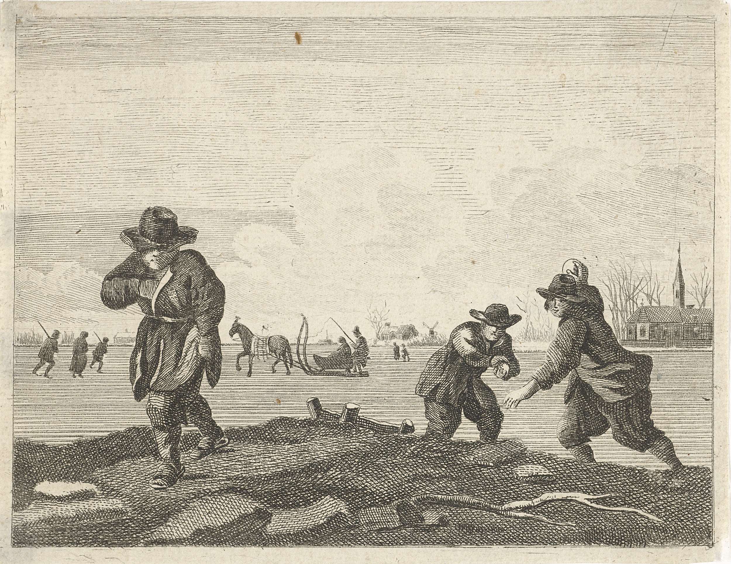 Twee jongens staan op het punt sneeuwballen te gooien naar een derde jongen op de voorgrond. Achter hen een bevroren rivier waarop een paard met een slee. Kopie naar de gelijknamige prent van Anthonij van der Haer.