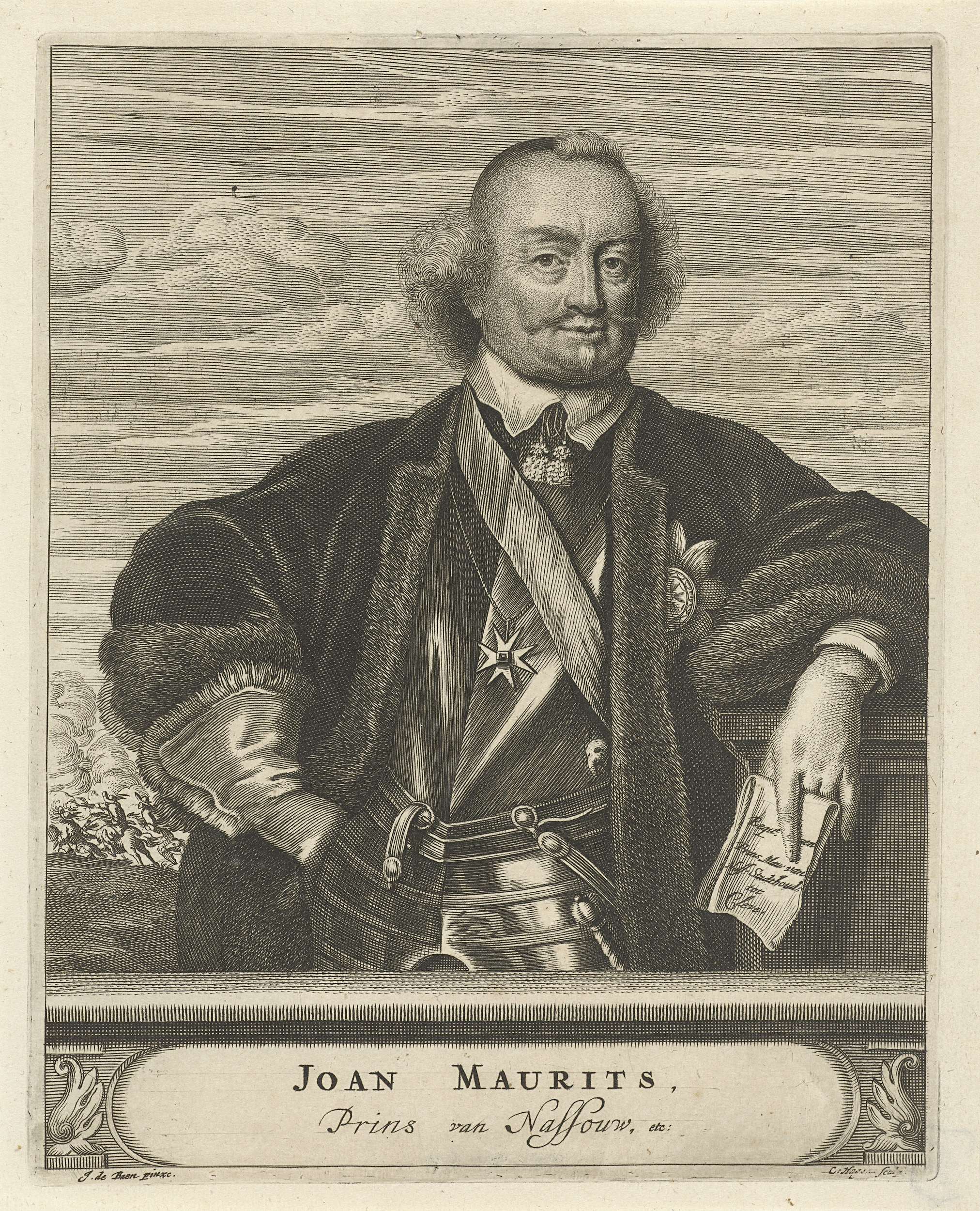 Portret ten halven lijve van Johan Maurits, graaf van Nassau-Siegen. Hij draagt een harnas, met daarover een mantel gevoerd met bont en leunt met zijn linkerarm op een zuil. In zijn linkerhand houdt hij een brief met daarop zijn titels. Om zijn hals een ketting met een Maltezer kruis. Op de achtergrond is een veldslag ...