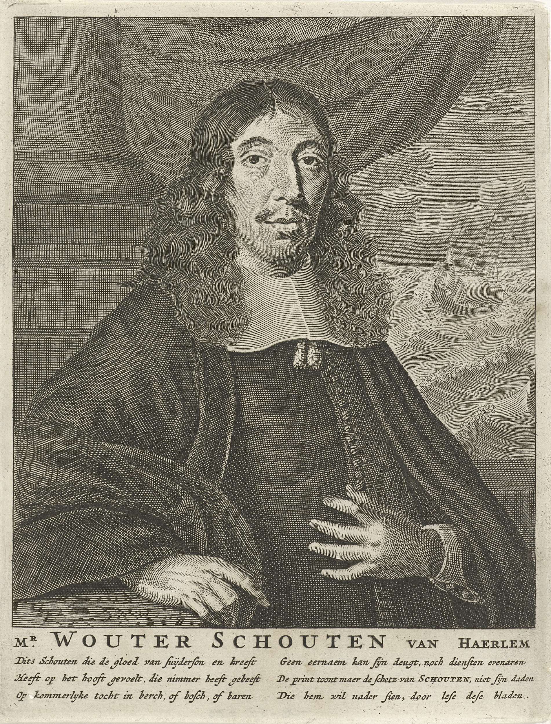 Portret ten halven lijve naar rechts van Wouter Schouten. Op de achtergrond een zeilschip op woelige zee. Onder zijn portret zijn naam en twee kolommen met elk drie versregels in het Nederlands.