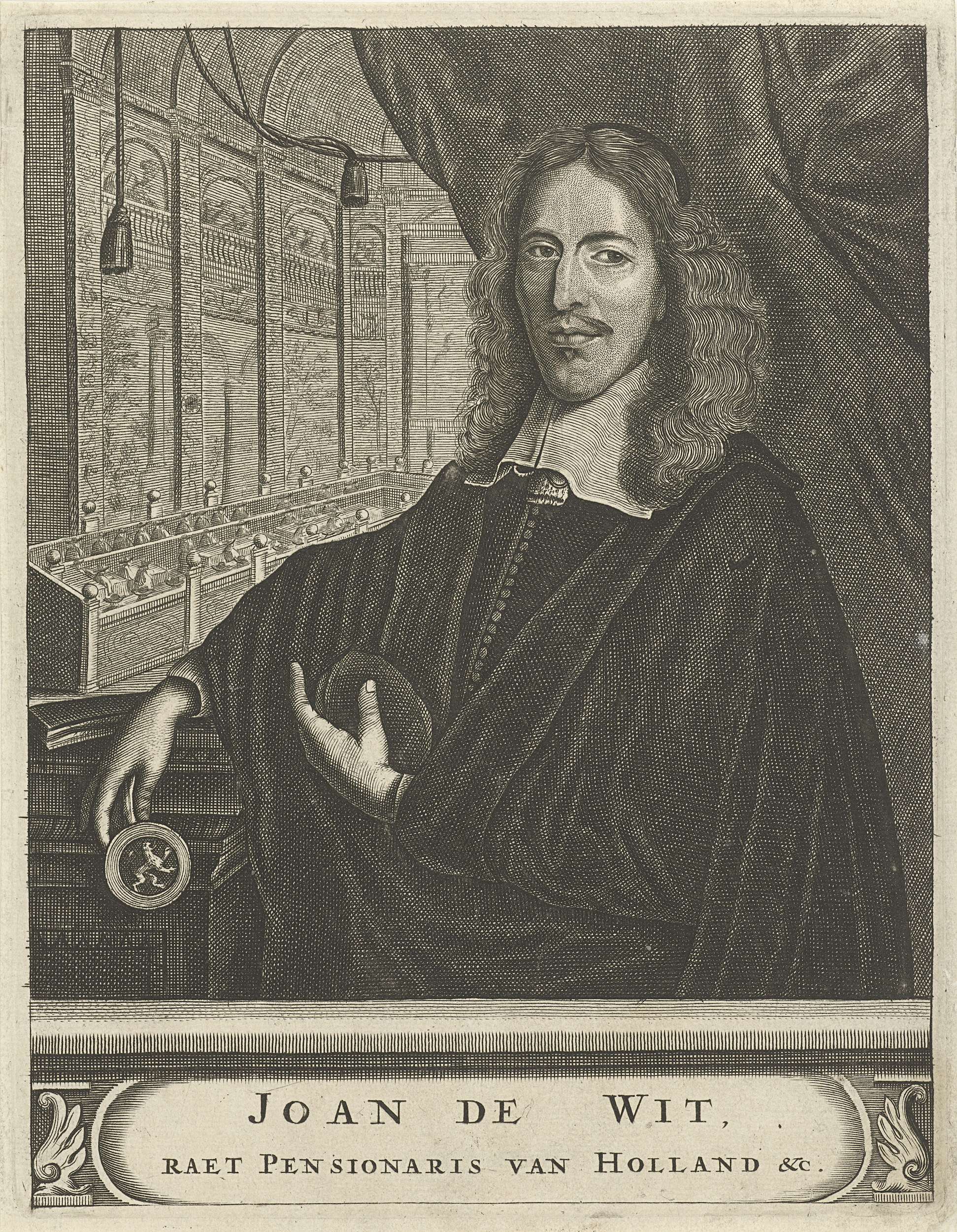 Portret ten halven lijve van Johan de Witt, gekleed in een mantel en staand voor een gordijn met daarachter een vergaderzaal. In zijn rechterhand een zegel met de Nederlandse leeuw, symbool voor de Republiek. Onder zijn portret een plint met daarop zijn naam en titel in twee regels in een cartouche.