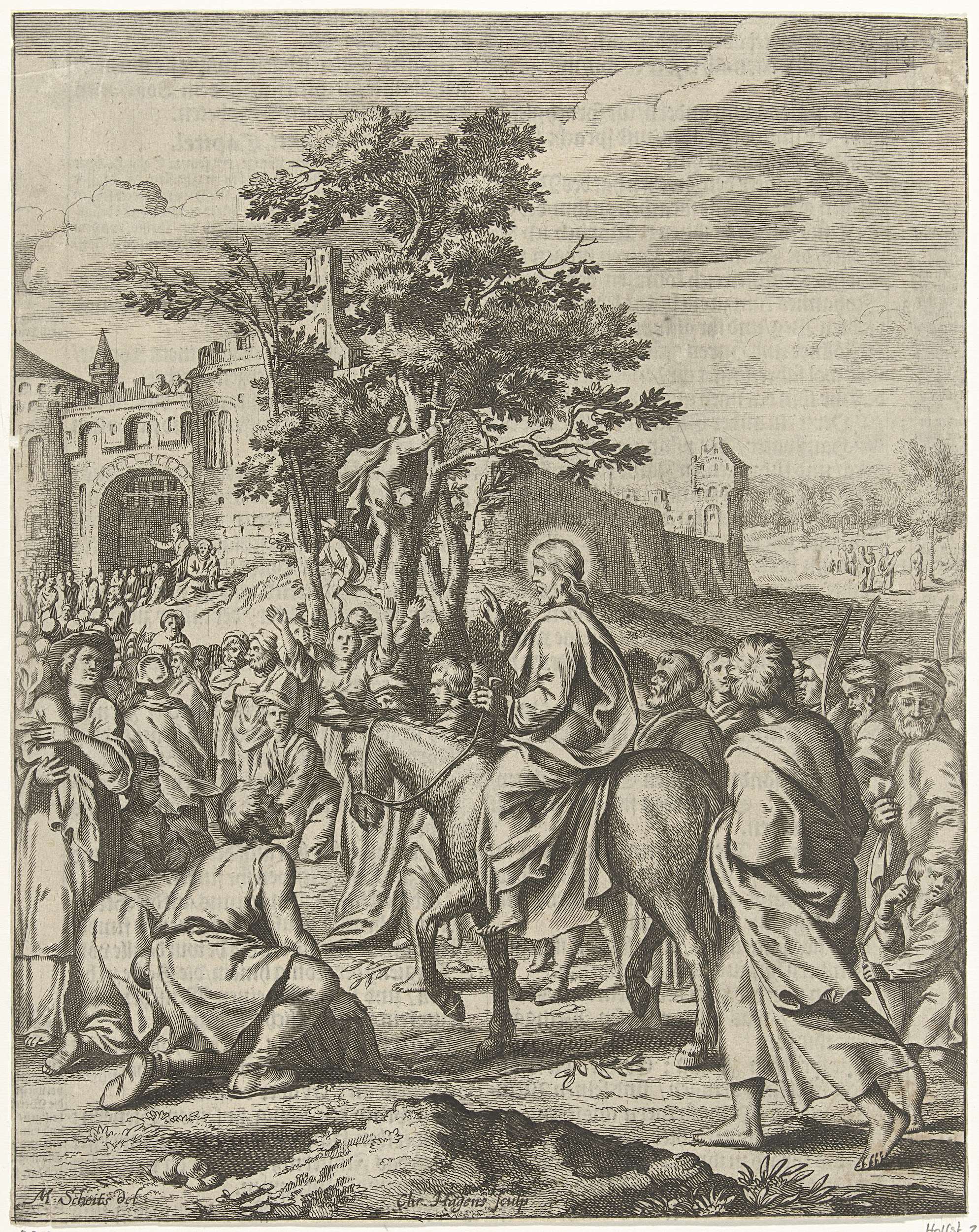 Christus, gezeten op een ezel, rijdt richting de stadspoort van Jeruzalem. Om hem heen leggen mensen hun mantels op de grond en houden plamtakken vast.