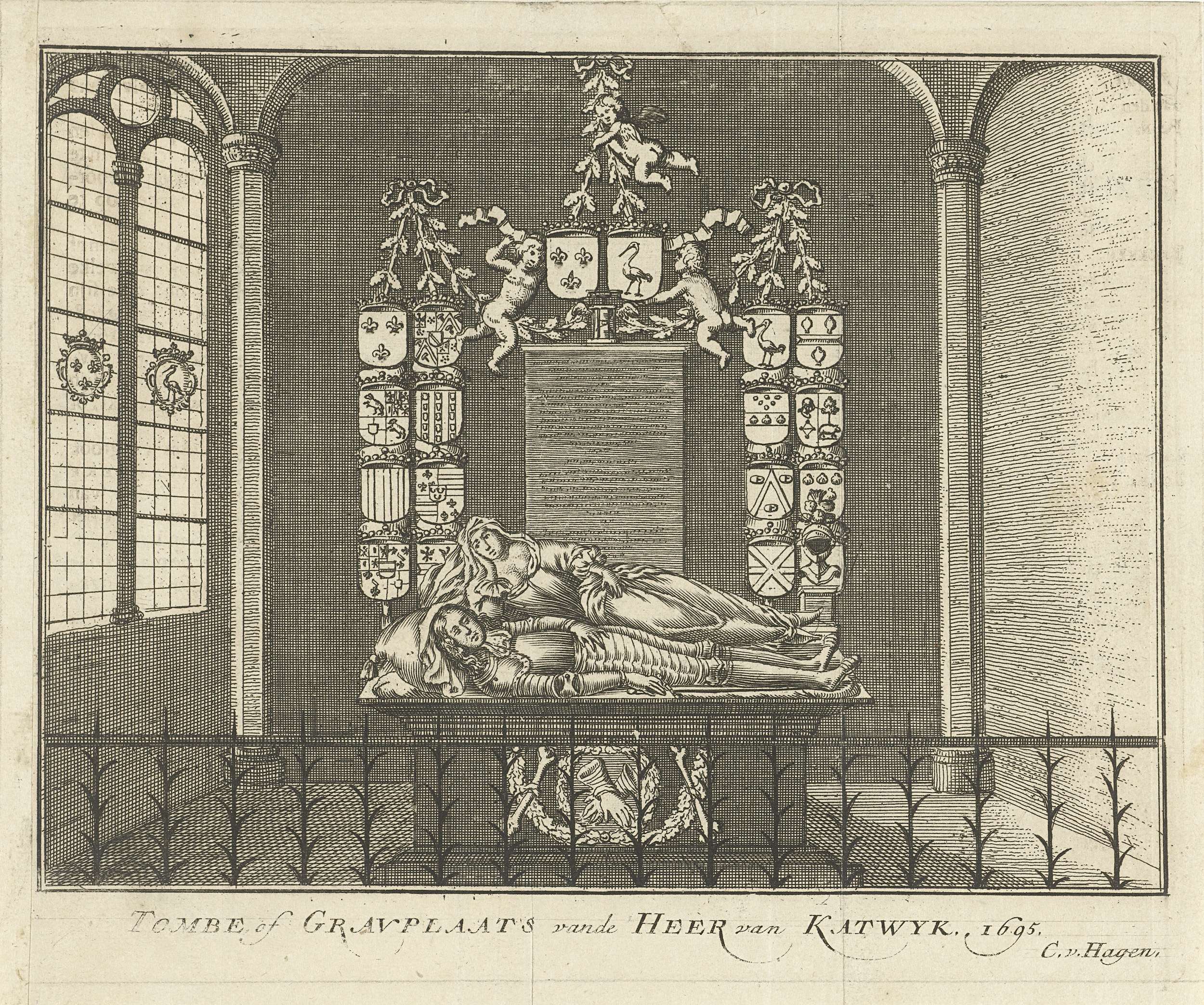 Praalgraf van het echtpaar Maria van Reigersberch (ca. 1620-1673) en Willem van Liere, baron van Wassenaer van Catwijck (1620-1654), gemaakt door Rombout Verhulst, in de kerk van Katwijk. Boven de tombe een plaat met inscriptie met aan weerszijden twee rijen wapens. Bovenaan nogmaals twee wapens en twee putti met guirlandes.