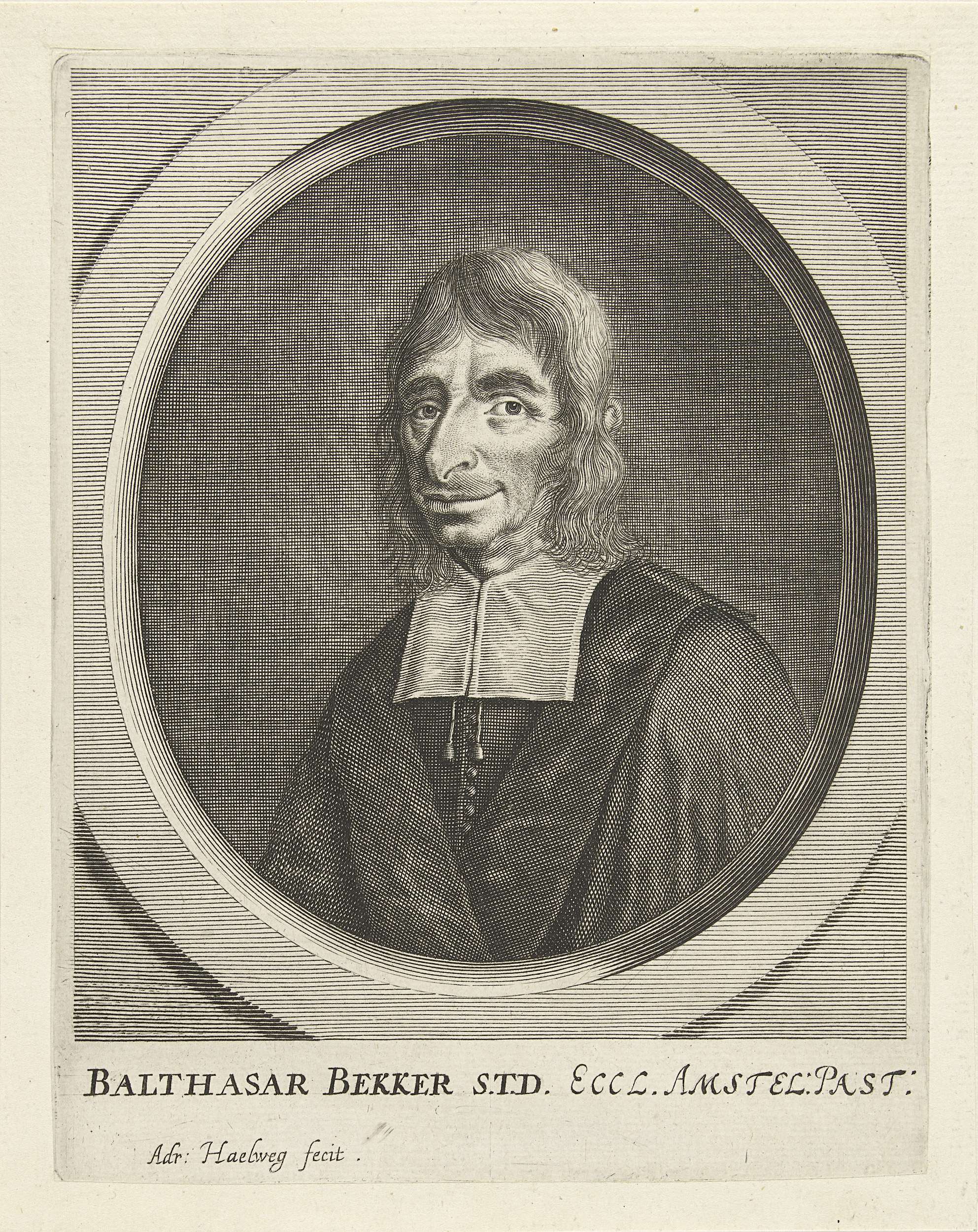 Portret naar links van de theoloog Balthasar Bekker in een ovaal.