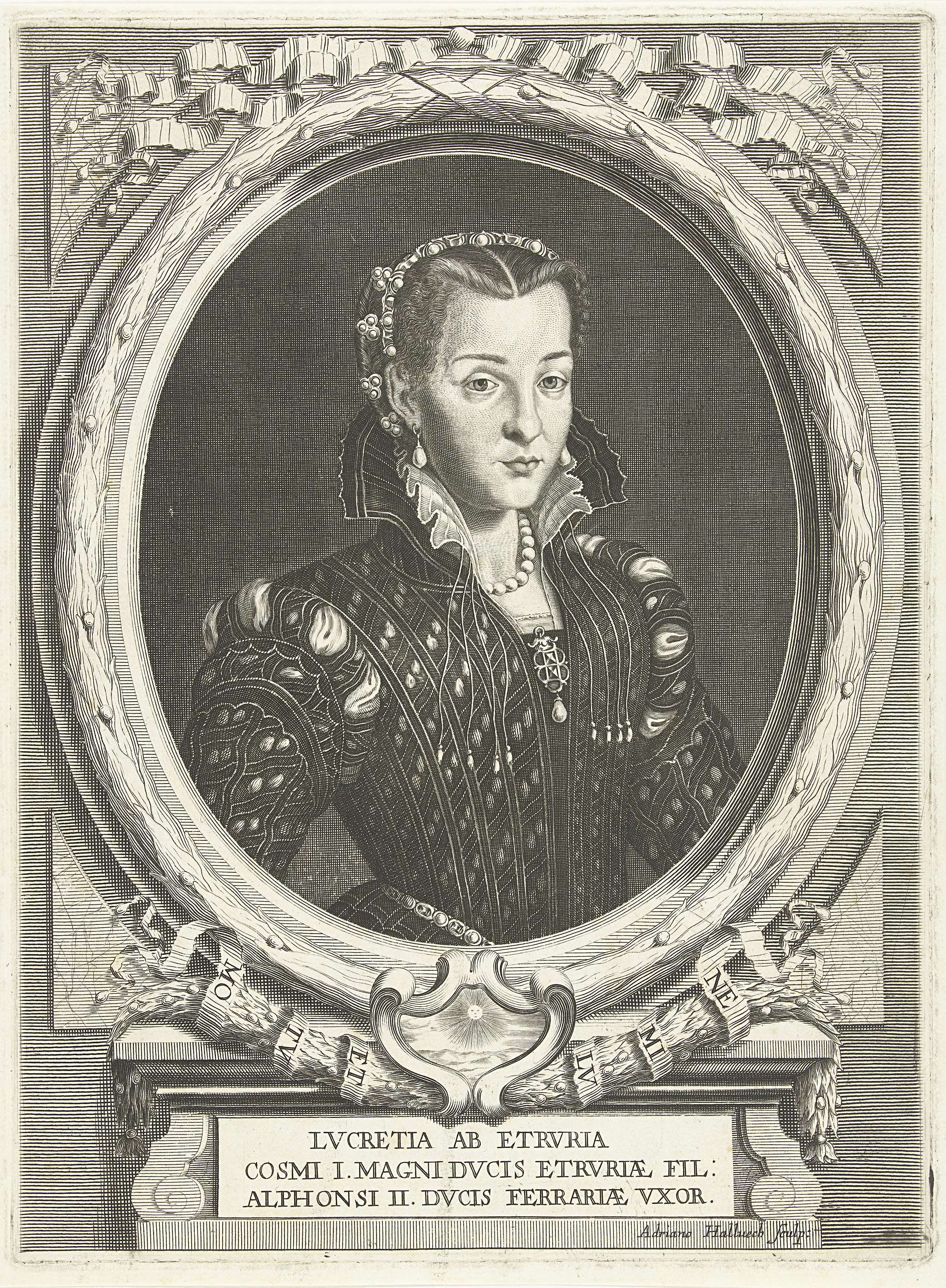 Portret ten halven lijve naar rechts van Lucretia de Medici, dochter van Cosimo I en echtgenote van Alfonso II hertog van Ferrara, in een ovaal omringd met een lauwerkrans. Onderaan in een cartouche een zon, daaronder op een tablet onder een plint haar naam en twee regels in Latijn.