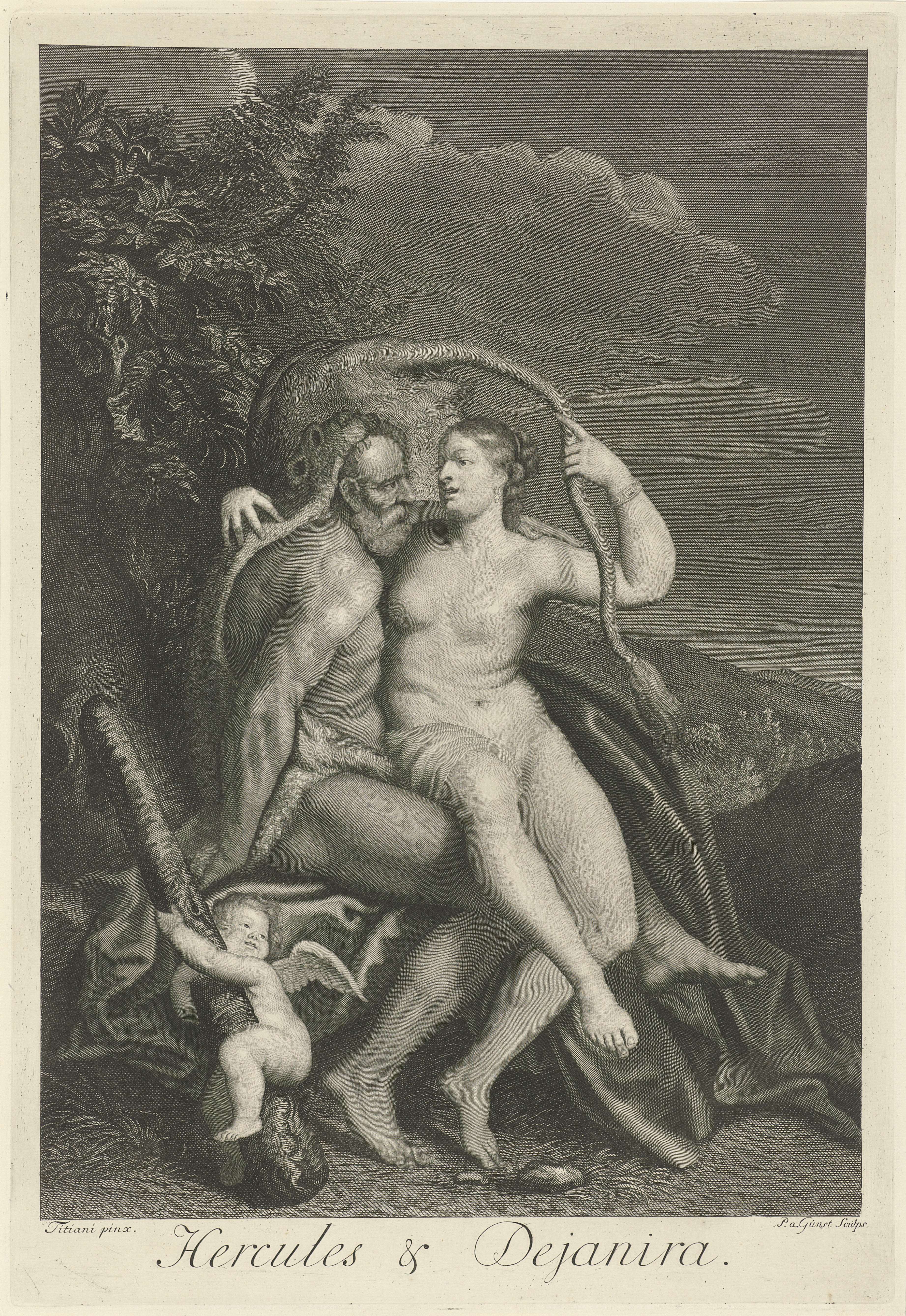 Deïanira zit op Hercules' schoot en omarmt hem. Cupido speelt met de knots van Hercules.