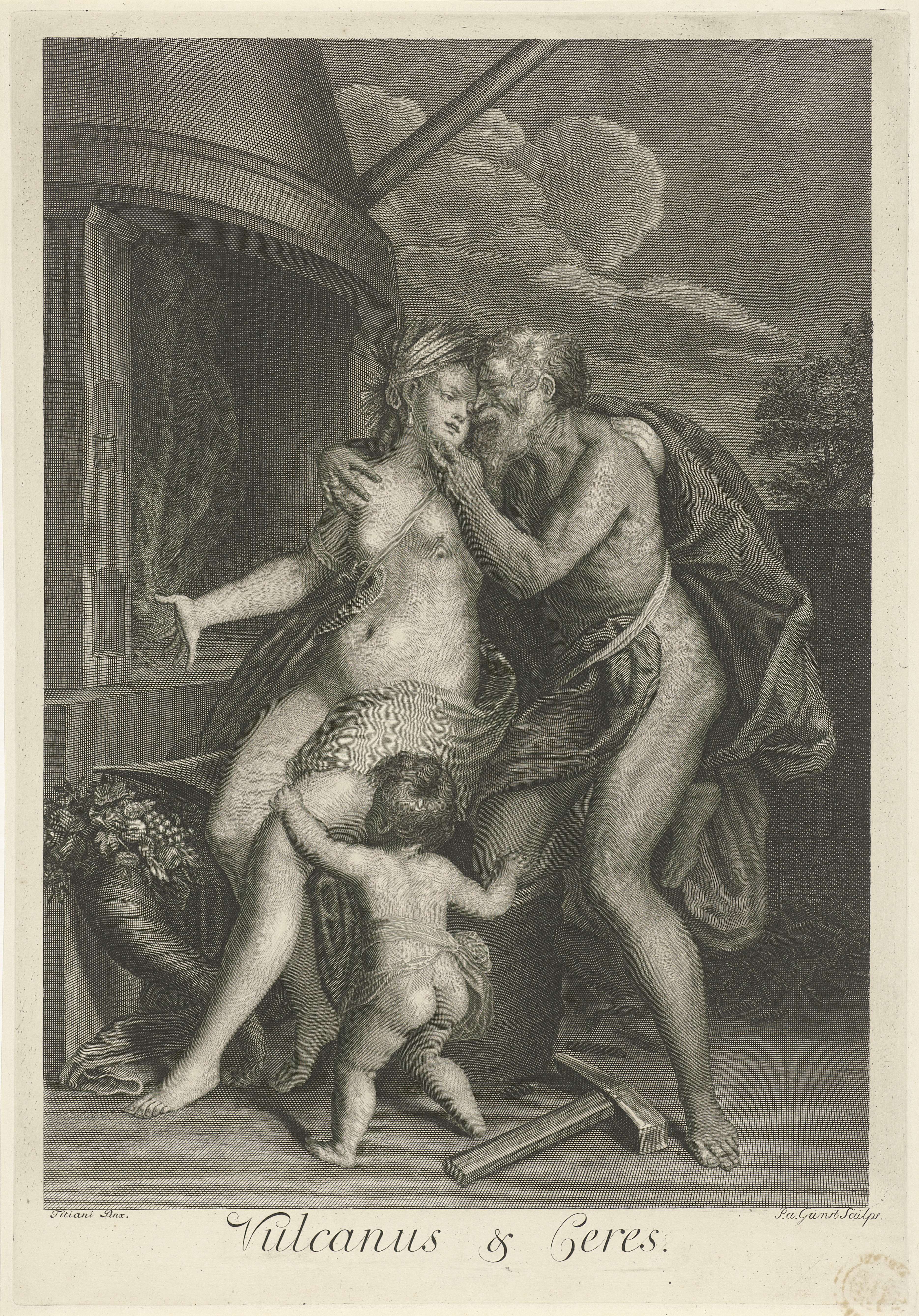 Ceres zit voor het vuur van de smidse. Vulcanus kust haar. Op de voorgrond Cupido en de hoorn des overvloeds.