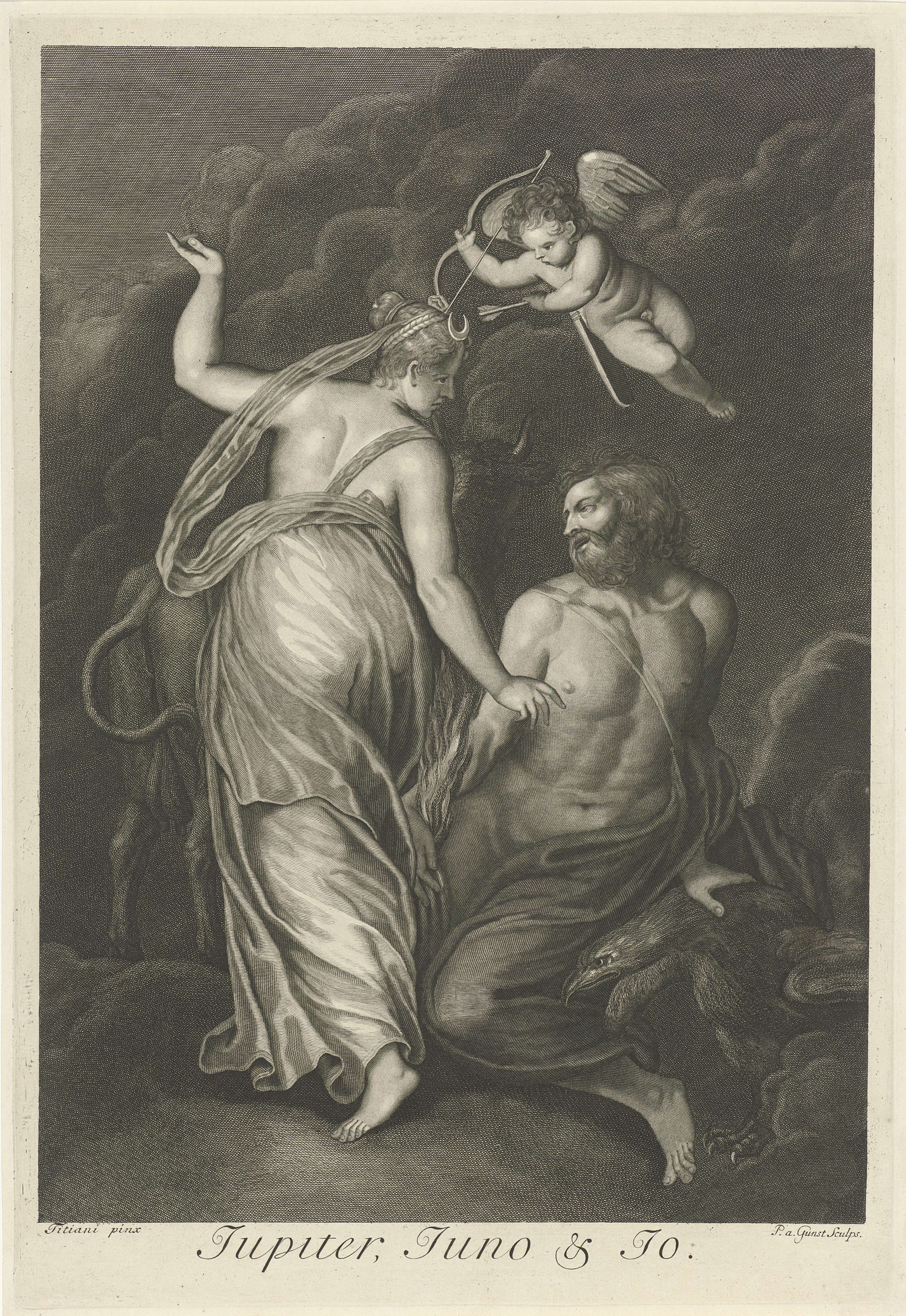 Op de voorgrond Jupiter en Juno. Boven hen vliegt Cupido. Op de achtergrond Io, de geliefde van Jupiter, die door Jupiter in een witte koe is veranderd om haar voor zijn vrouw te verbergen.