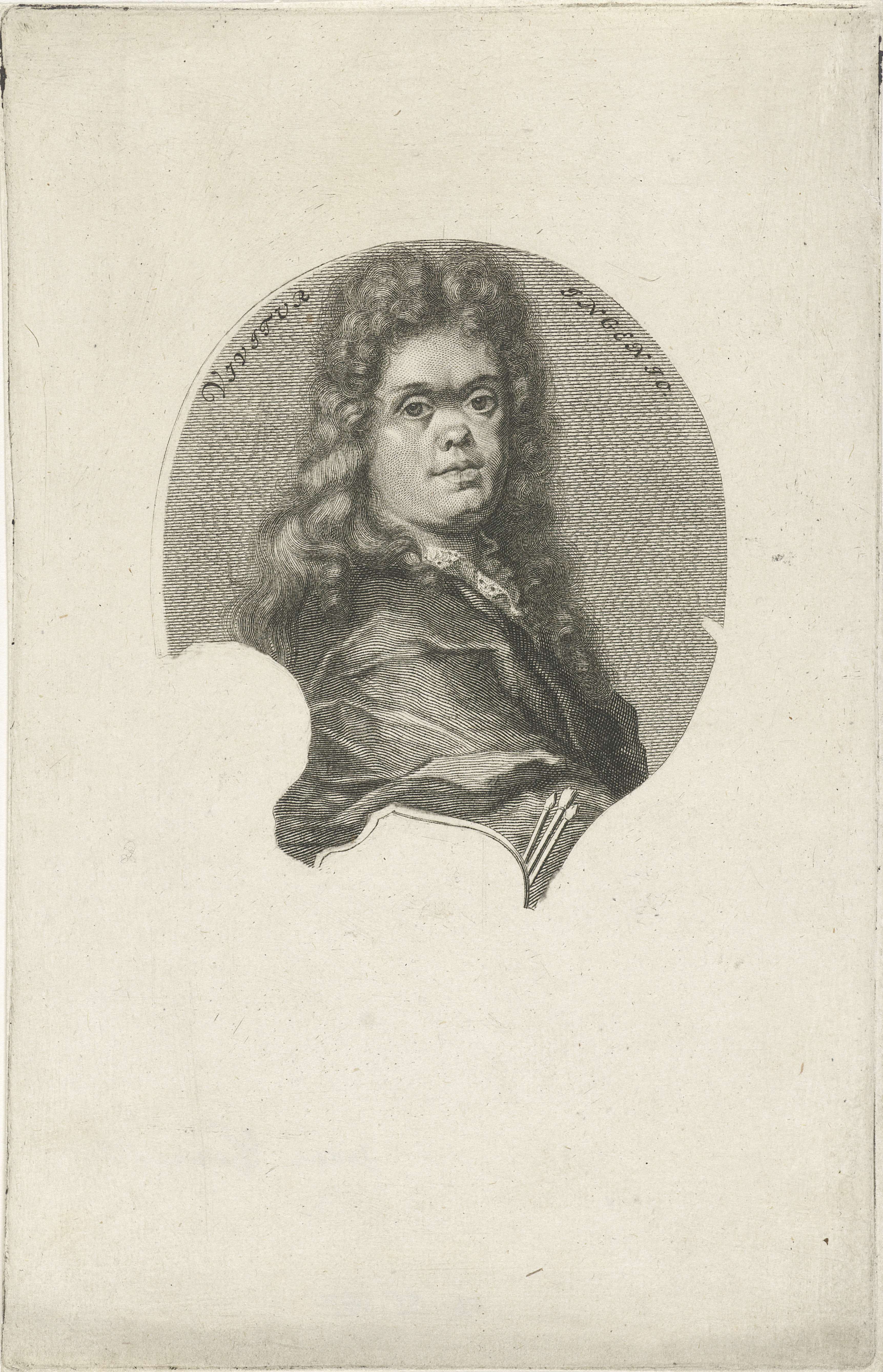 Gerard De Lairesse, een Luikse prentmaker en schilder. Boven zijn hoofd het motto: "Vivitura Ingenio". Het portret heeft de vorm van een schilderspalet.
