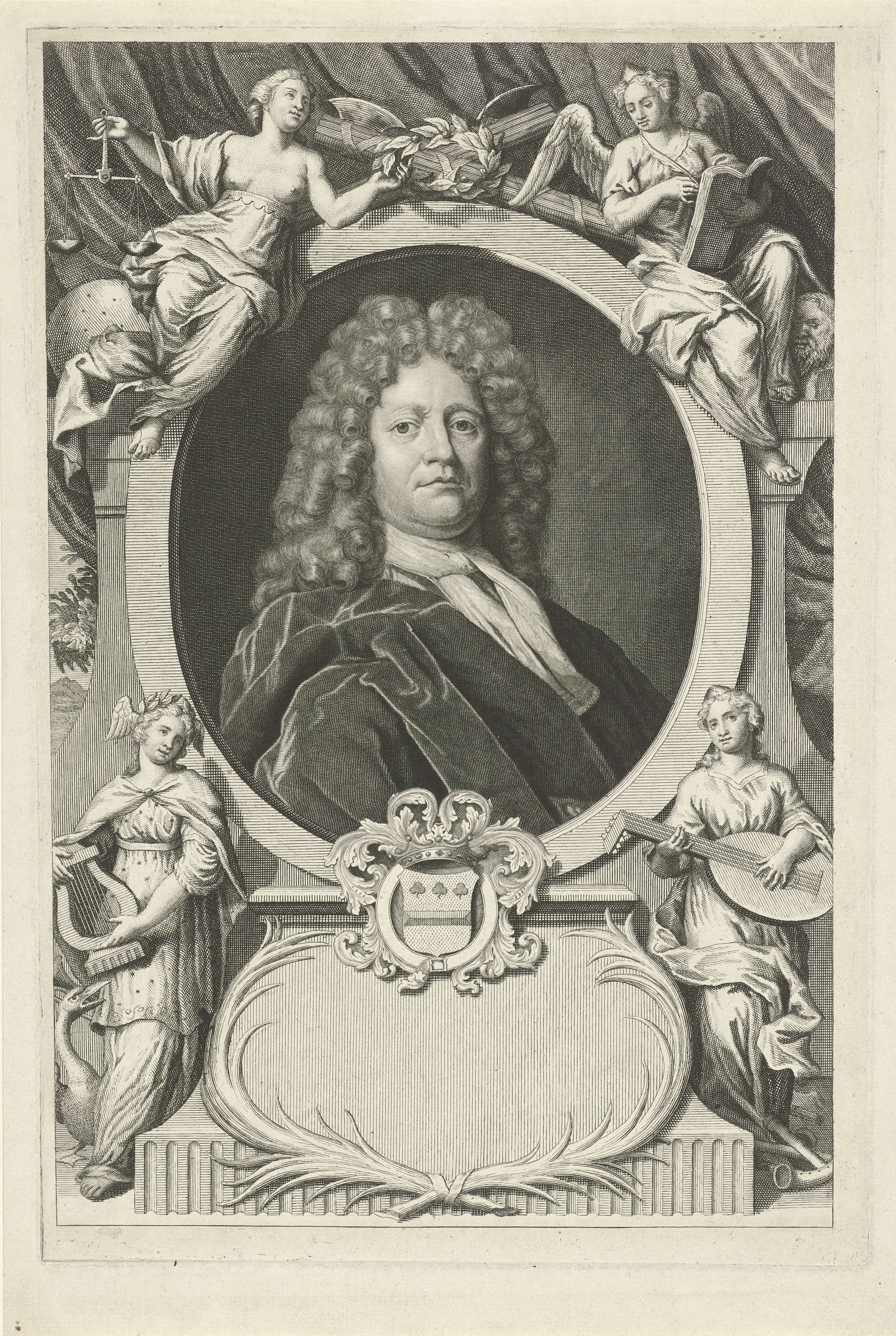 Alexander de Muncq, burgemeester van Middelburg en dichter, op 55-jarige leeftijd. Onder het portret zijn wapenschild. Boven het portret de personificaties van Rechtvaardigheid en Waarheid, die hem met een lauwerkrans kronen. Onder het portret spelen twee muzen de lier en de citer.
