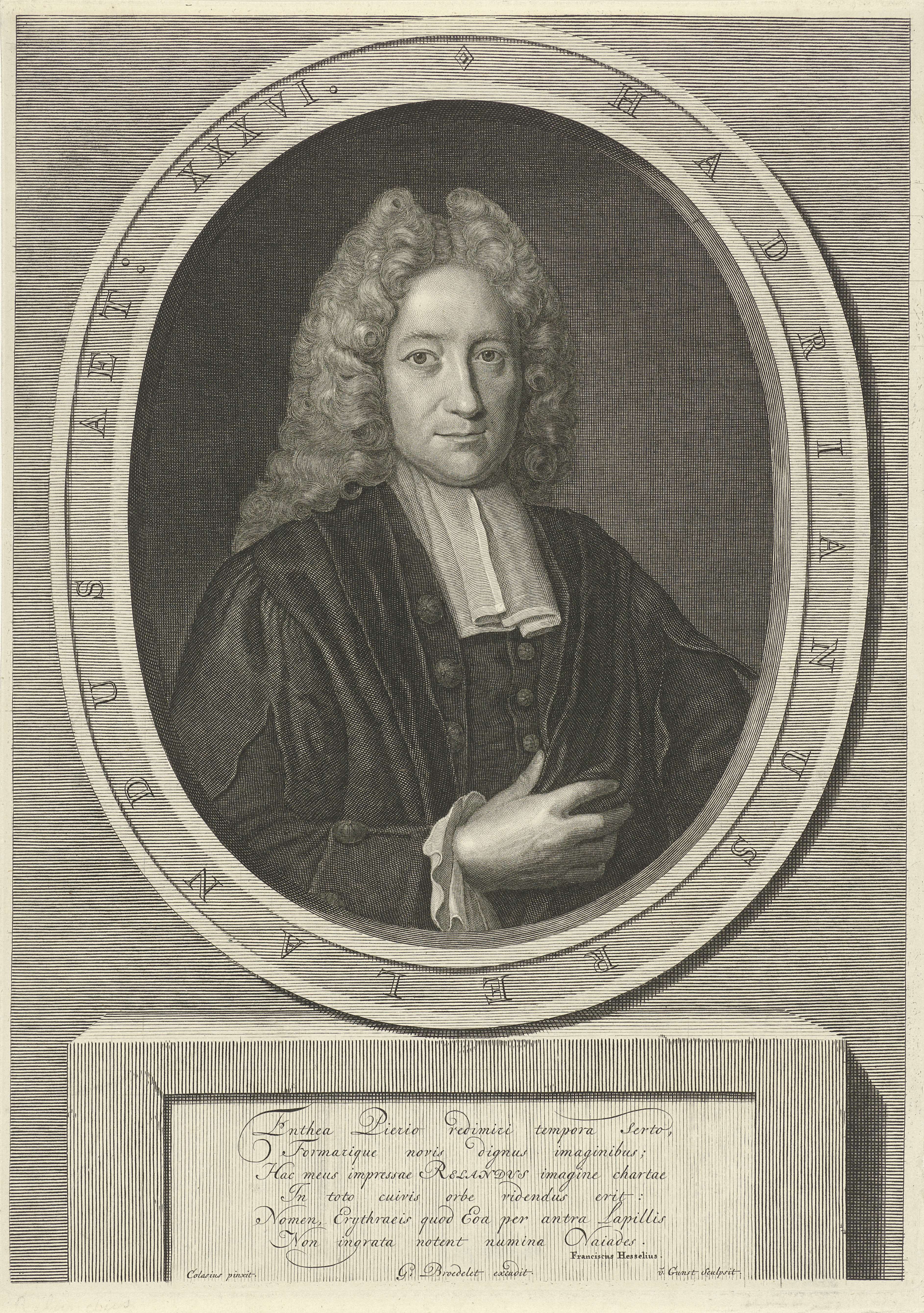 Adriaan Reland, hoogleraar Oosterse talen, cartograaf en Neolatijns dichter, op 36-jarige leeftijd. De prent heeft een Latijns onderschrift.