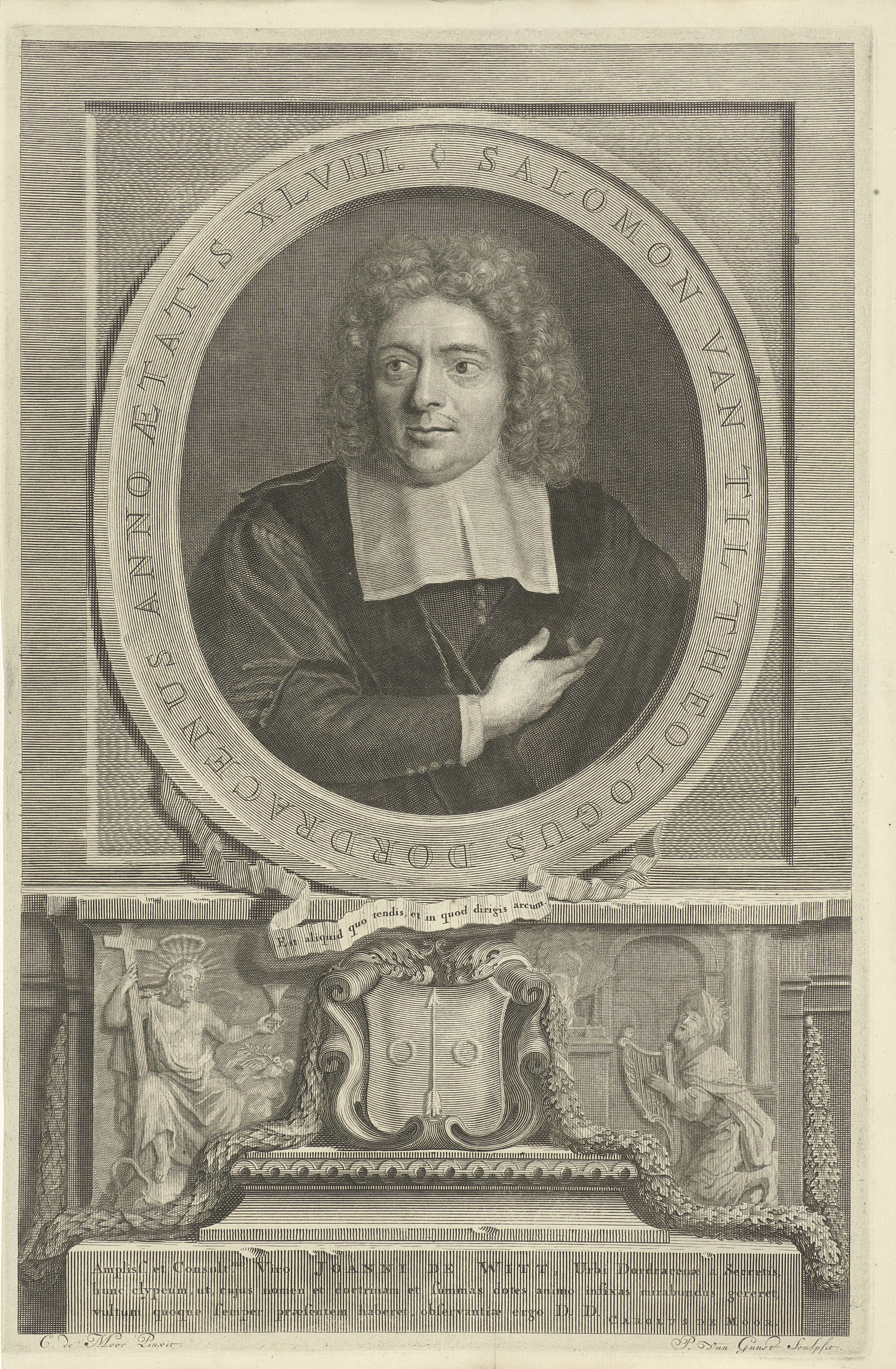 Salomon van Til, Coccejaans predikant. De prent heeft een Latijns onderschrift. Onder de prent zijn wapenschild.