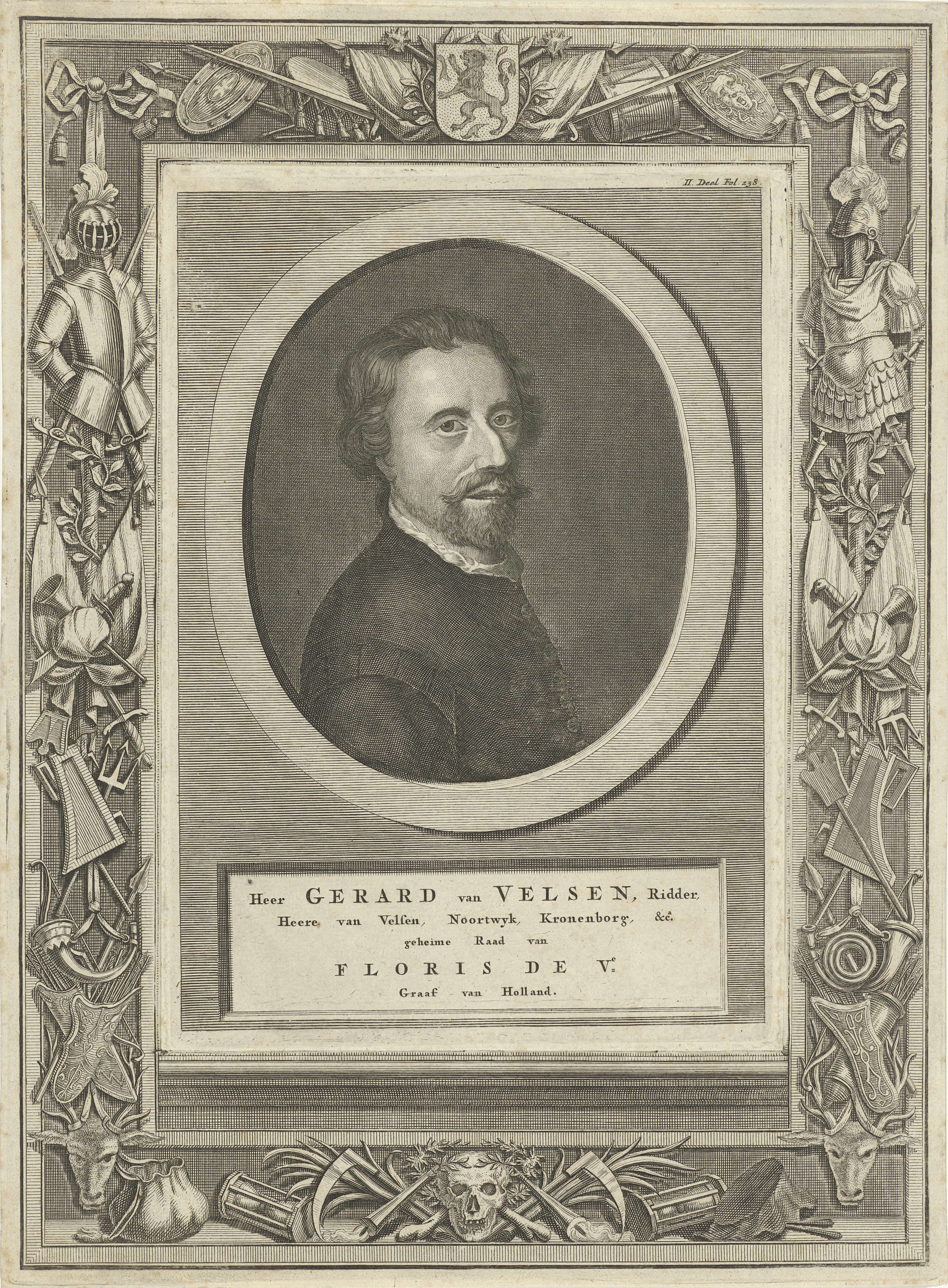 Gerard van Velzen, heer van Beverwijk en de moordenaar van Floris V, graaf van Holland. Rondom het portret een ornamentele rand met wapentuig.