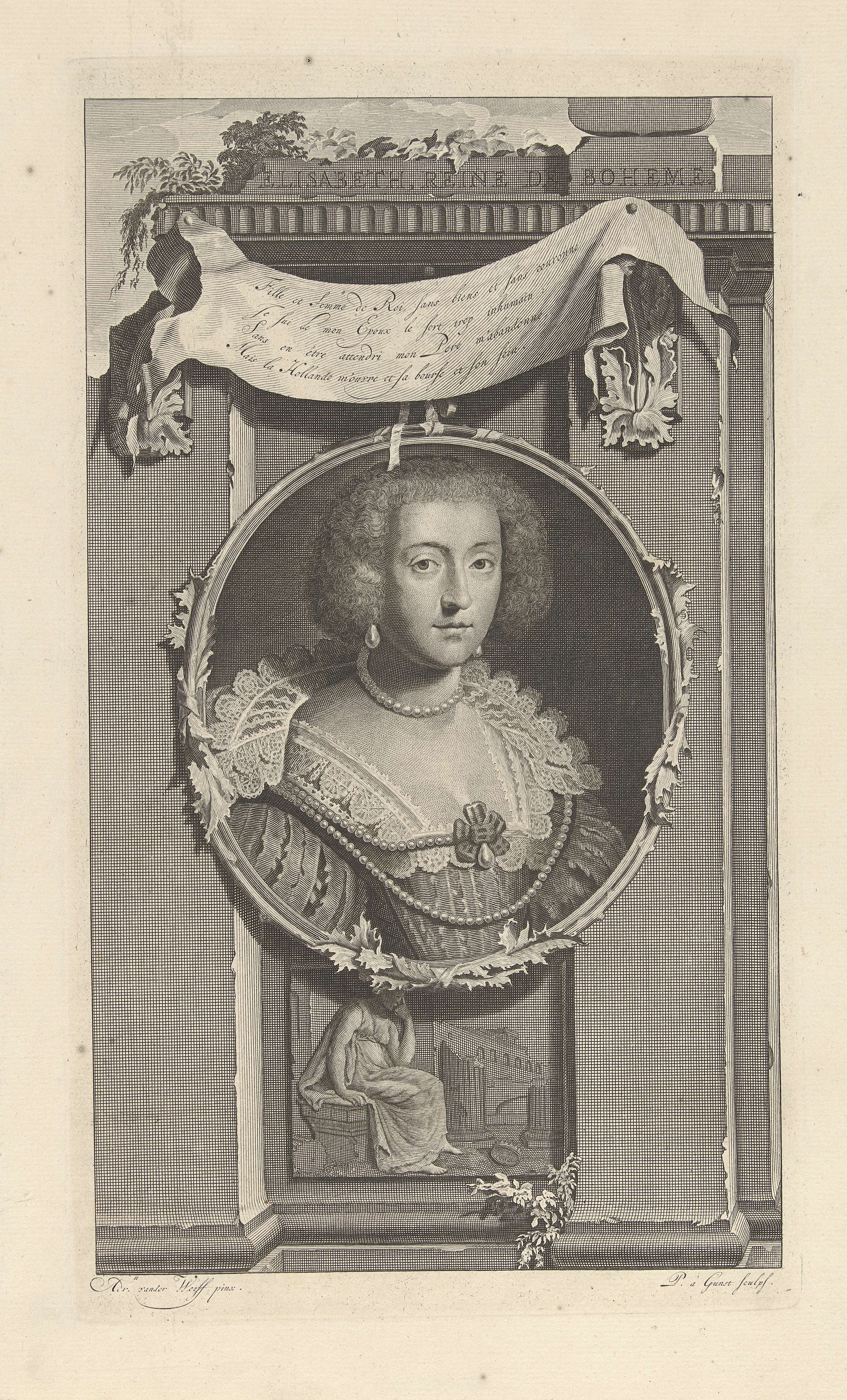 Elisabeth Stuart, koningin van Bohemen en keurvorstin van de Palts. Boven de prent een banderol met een Frans gedicht over haar leven. Onder de prent een voorstelling van landschap met klassieke ruïnes met op de voorgrond de personificatie Standvastigheid, een vrouw in klassieke kleding die naar een gevallen kroon kijkt.