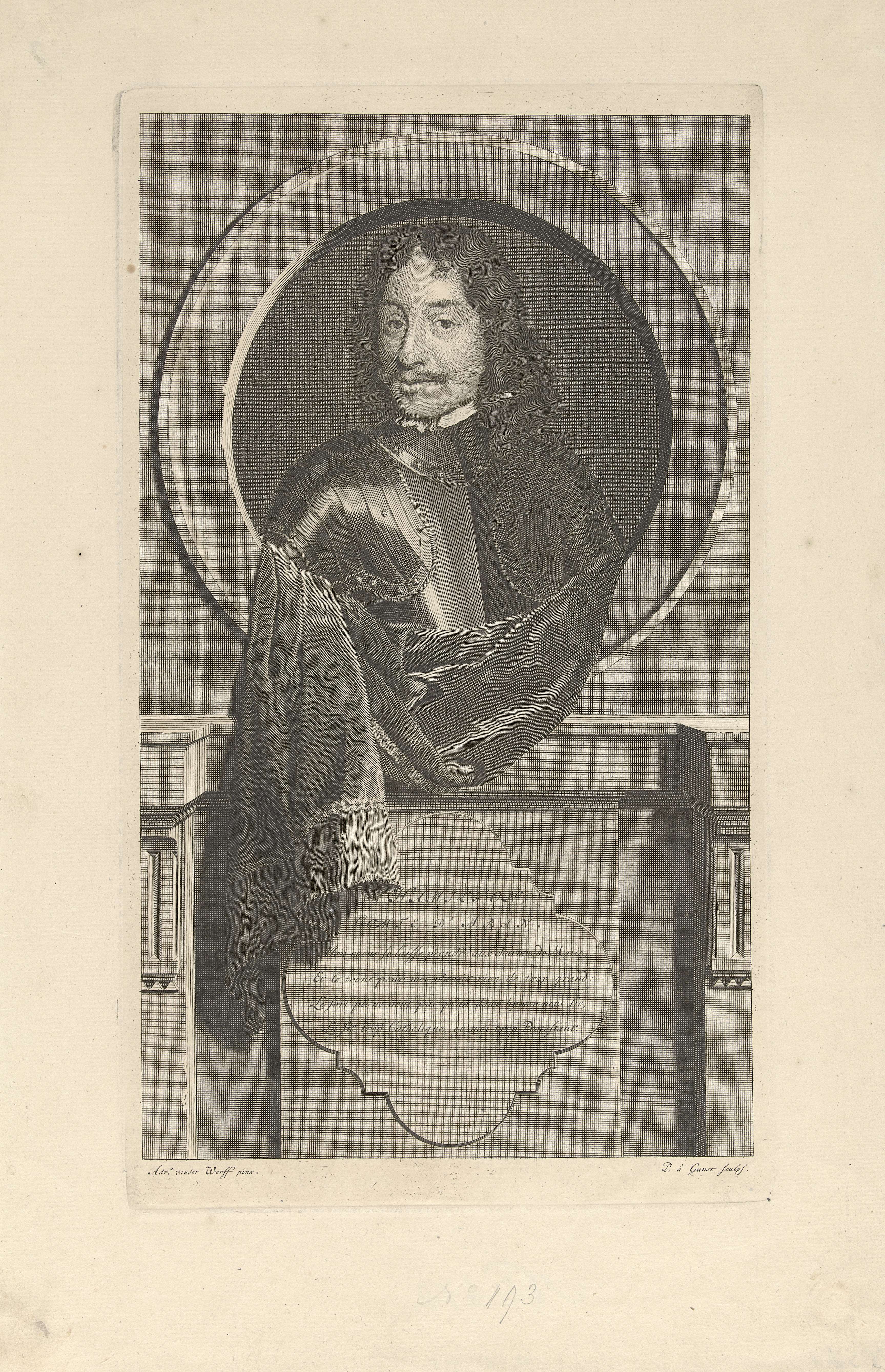 James Hamilton, graaf van Aran en eerste hertog van Hamilton. Generaal van het Schotse leger tijdens de Engelse burgeroorlog. De prent heeft als onderschrift een Frans gedicht over zijn leven.