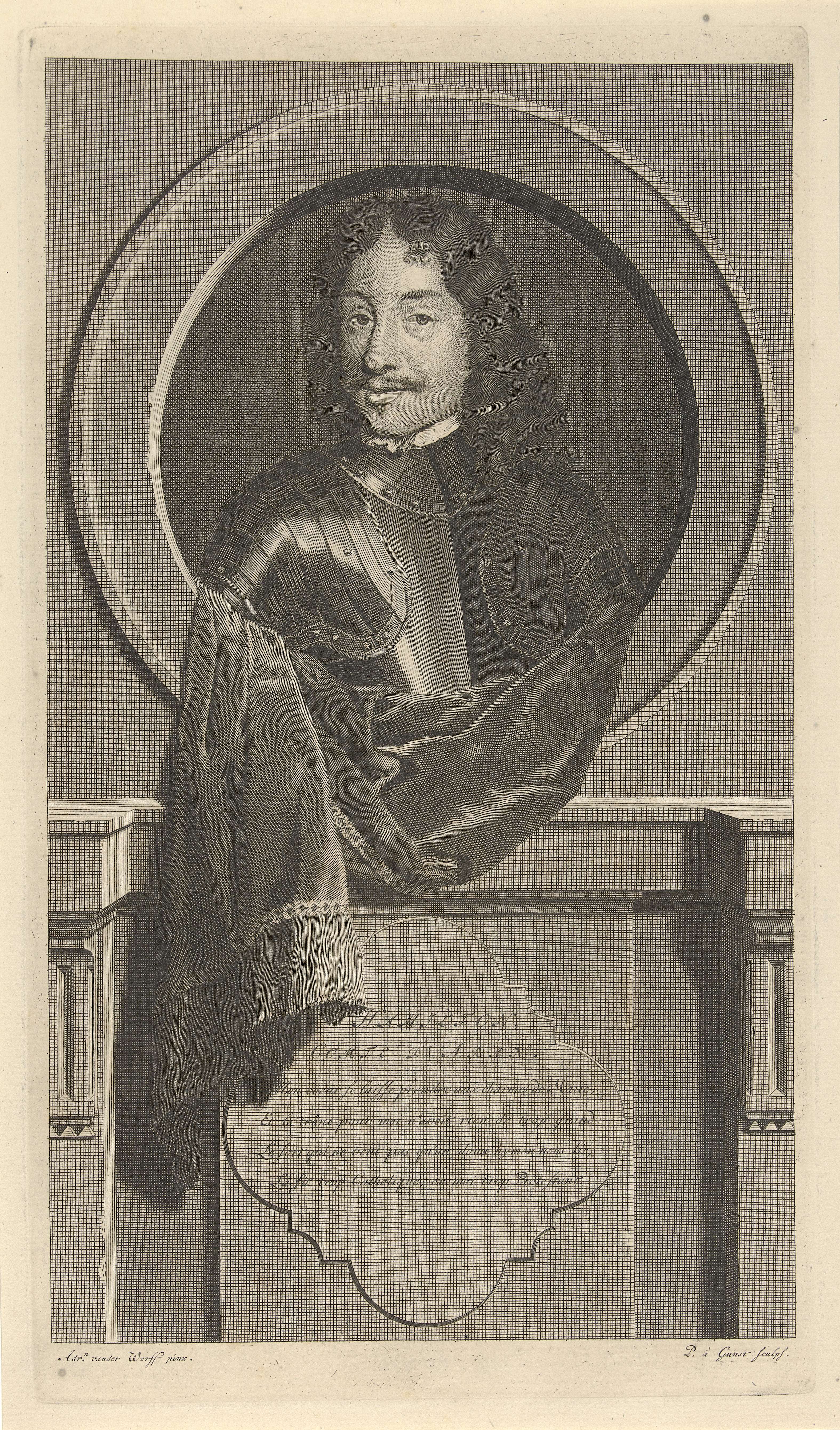 James Hamilton, graaf van Aran en eerste hertog van Hamilton. Generaal van het Schotse leger tijdens de Engelse burgeroorlog. De prent heeft als onderschrift een Frans gedicht over zijn leven.