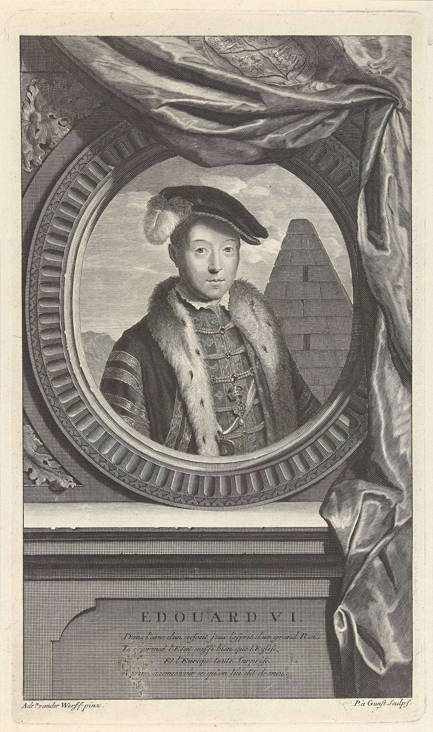 Edward VI, koning van Engeland. Op de achtergrond een piramide. De prent heeft als onderschrift een Frans gedicht over zijn leven.