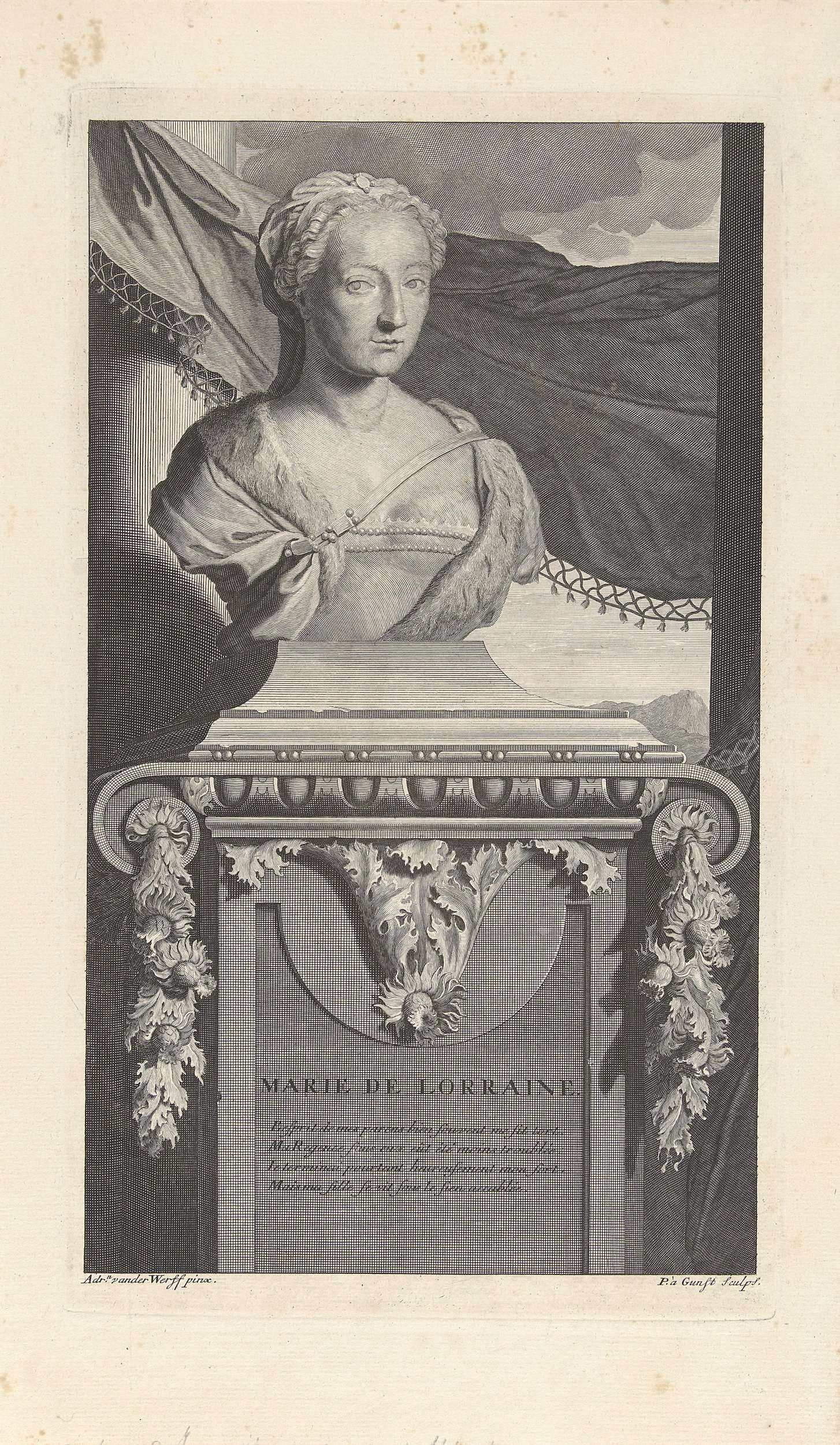 Standbeeldbuste van Marie de Lorraine en Guise, koningin van Schotland en latere regentes van Schotland. Het beeld staat op een voetstuk met een Frans gedicht over haar leven.