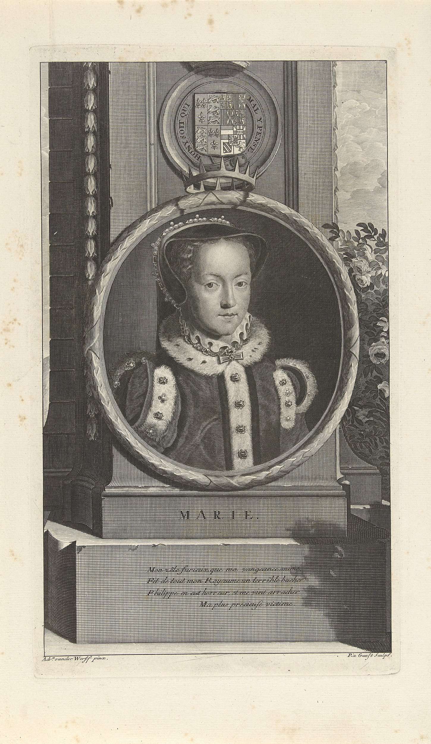 Maria Tudor, koningin van Engeland. Boven het portret het wapenschild van Engeland. De prent heeft als onderschrift een Frans gedicht over haar leven.
