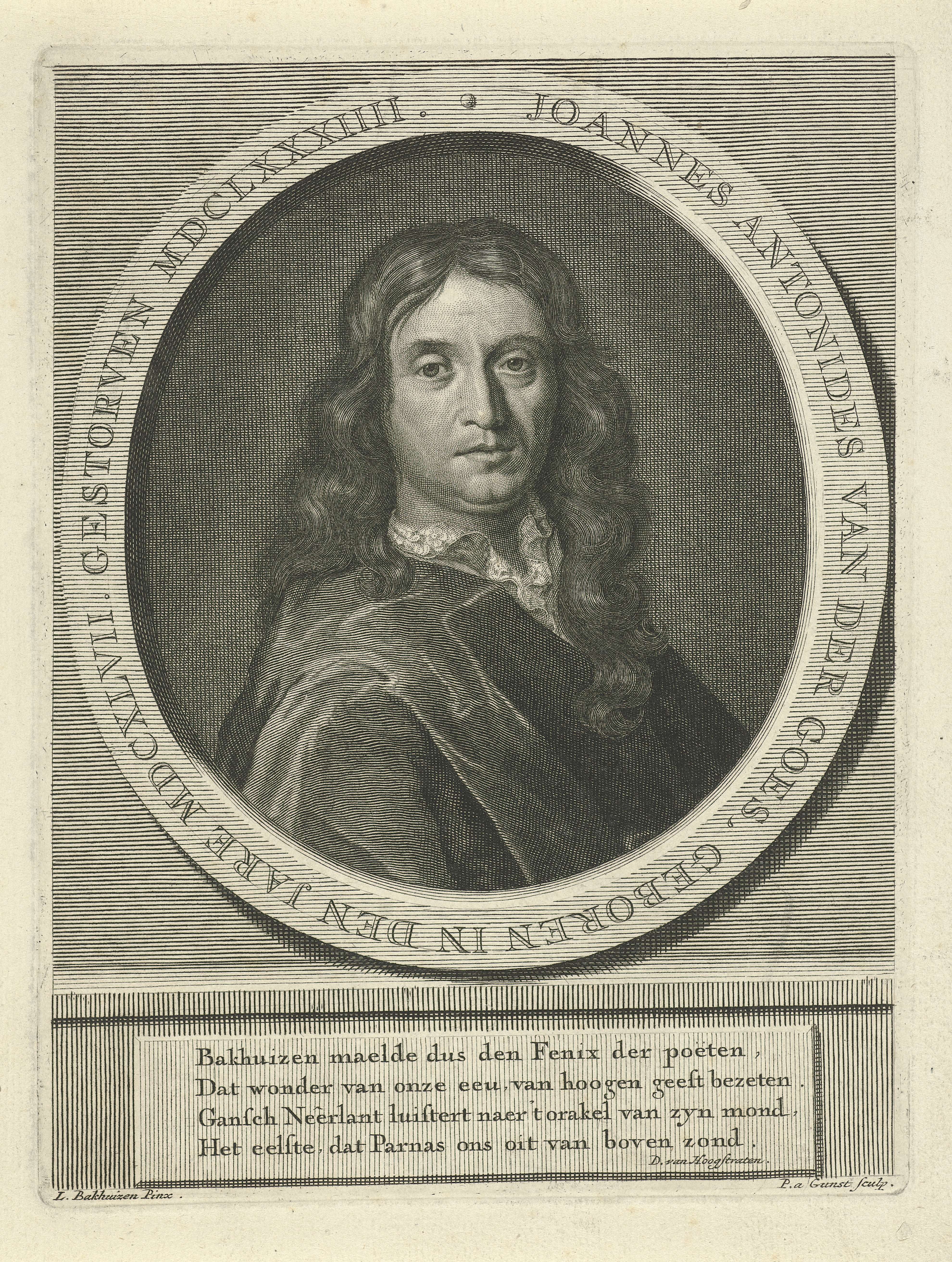 Jan Antonides van der Goes, Amsterdamse dichter en toneelschrijver. De prent heeft als onderschrift een Nederlands gedicht over zijn leven.