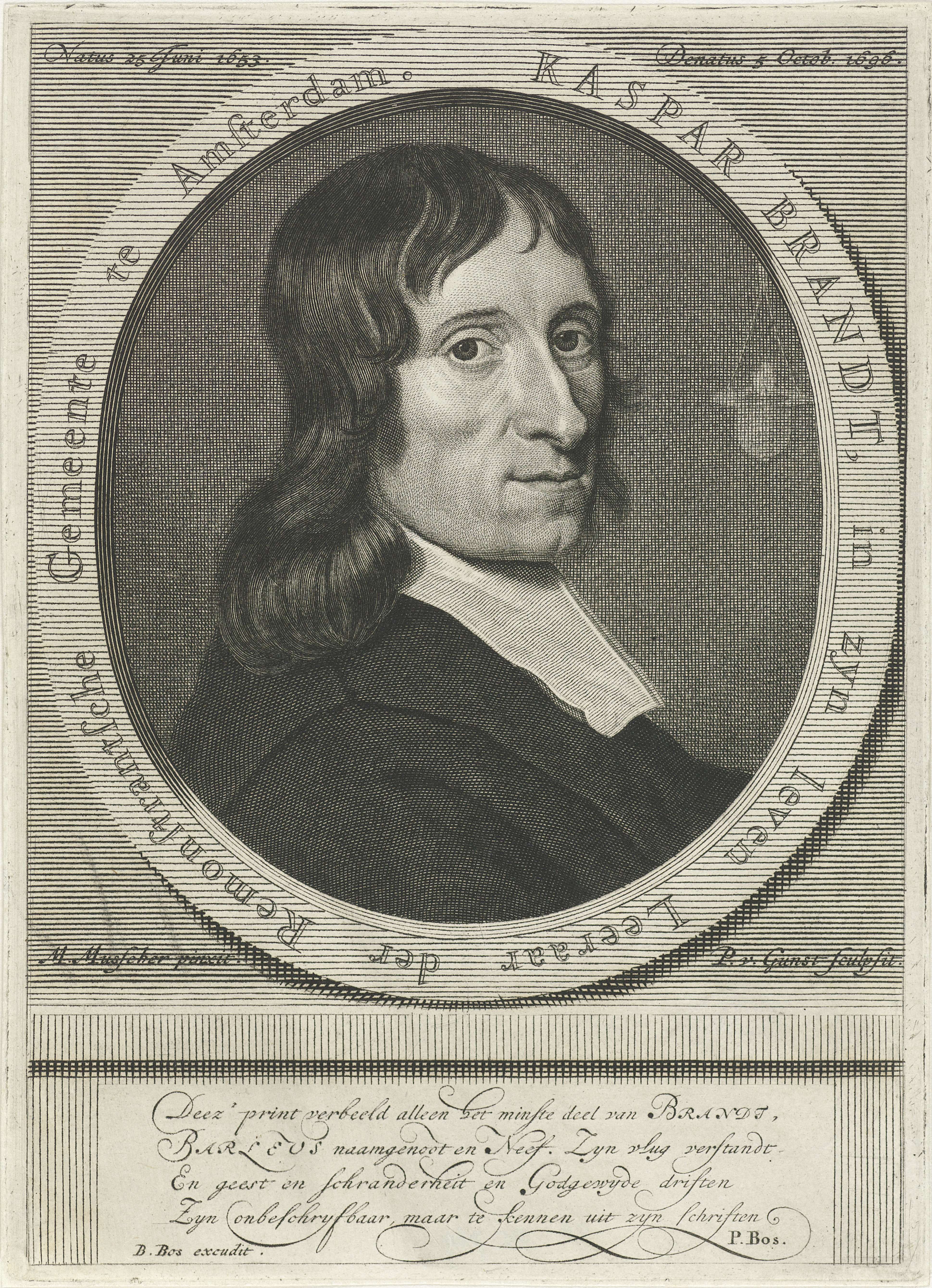 Kaspar Brandt, Nederlands predikant. De prent heeft als onderschrift een Nederlands gedicht over het leven van Brandt.
