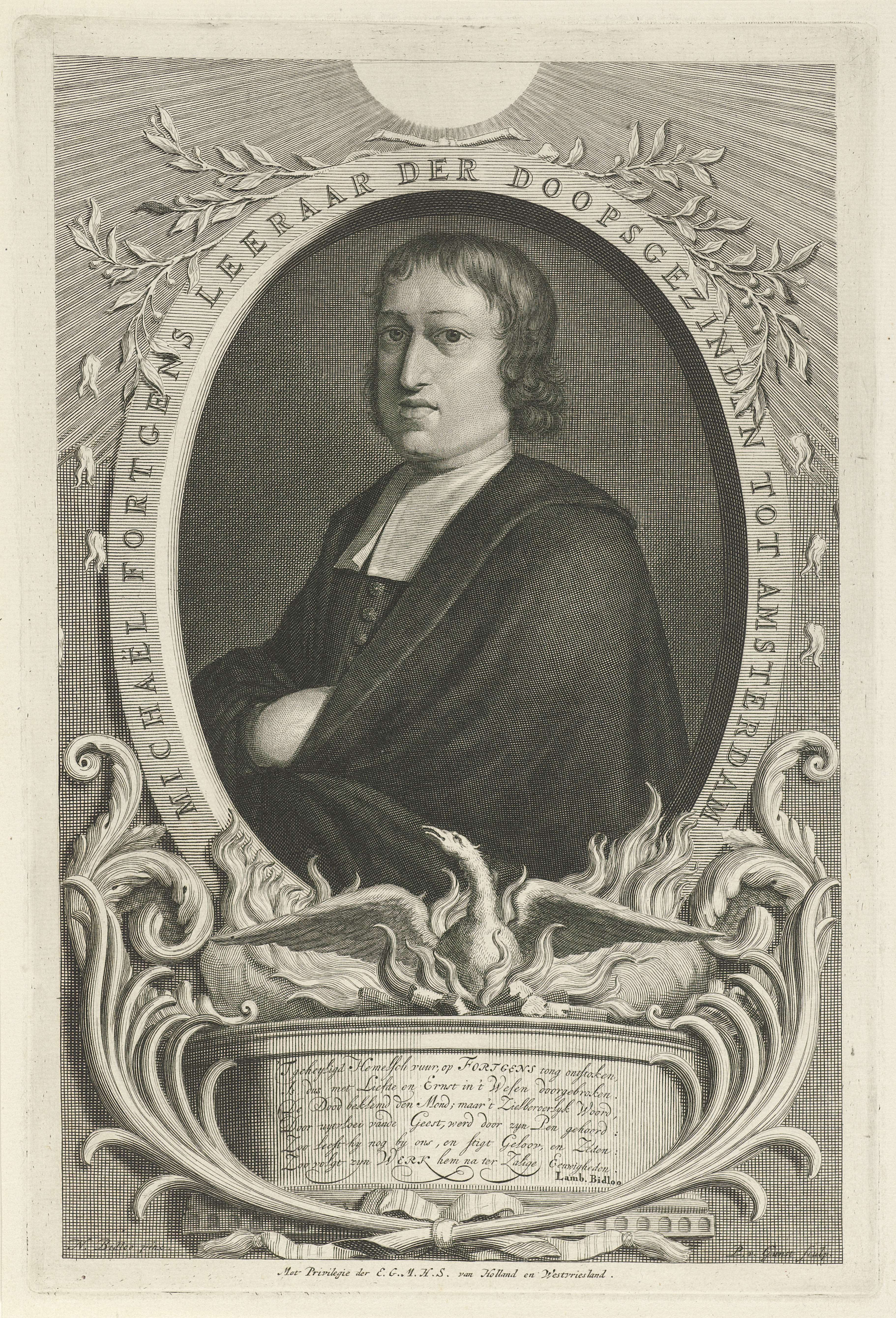 Michael Fortgens, Amsterdams predikant en leraar van de doopsgezinde gemeente aldaar. Onder het portret een feniks en een Nederlands gedicht over zijn leven.