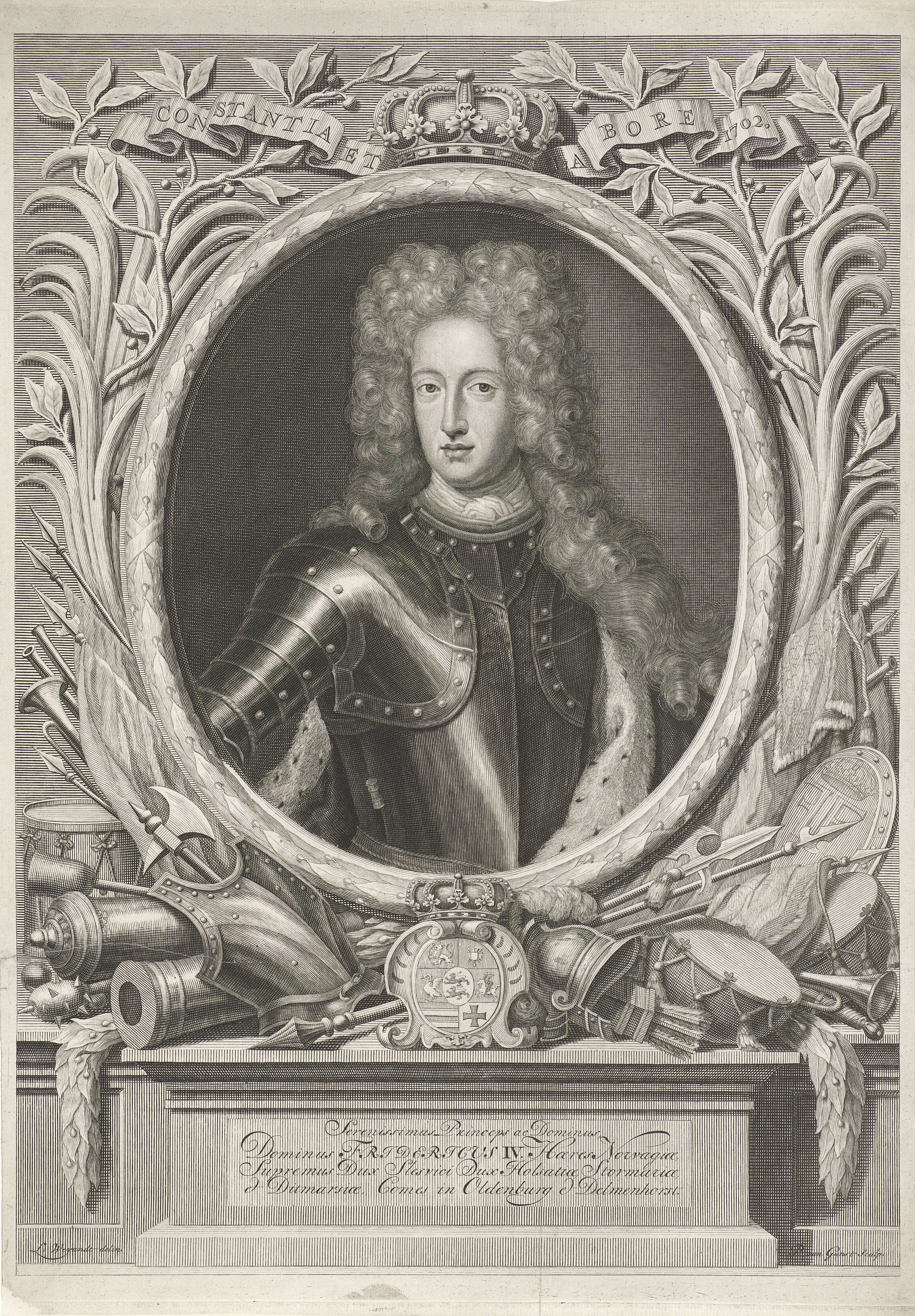 Frederik IV, koning van Denemarken en Noorwegen. Onder het portret zijn wapenschild. Boven het portret een banderol met het motto: "Constantia et Labore"