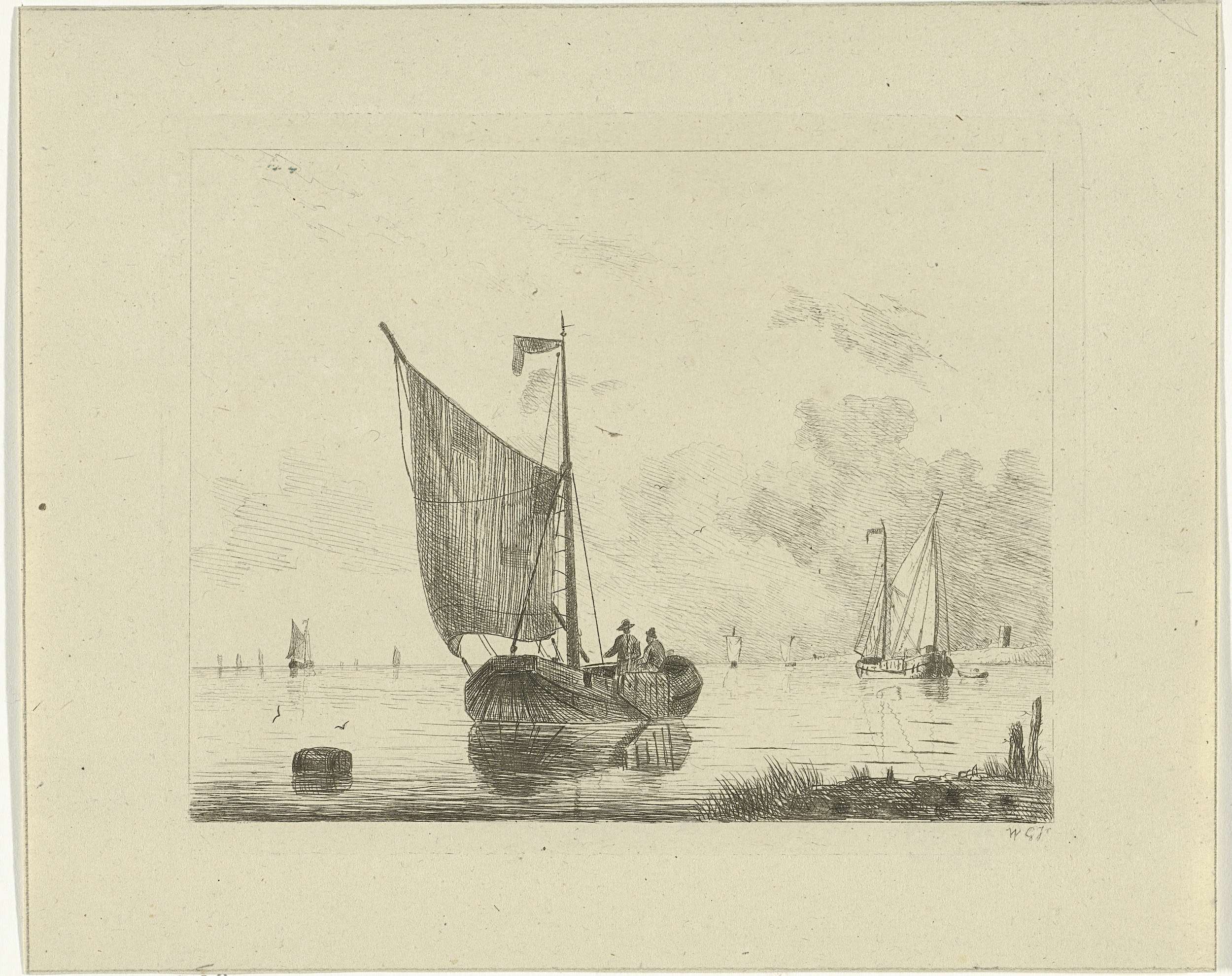 Vissersboot met twee vissers, op de achtergrond verscheidene zeilschepen, links op de voorgrond een drijvende ton.