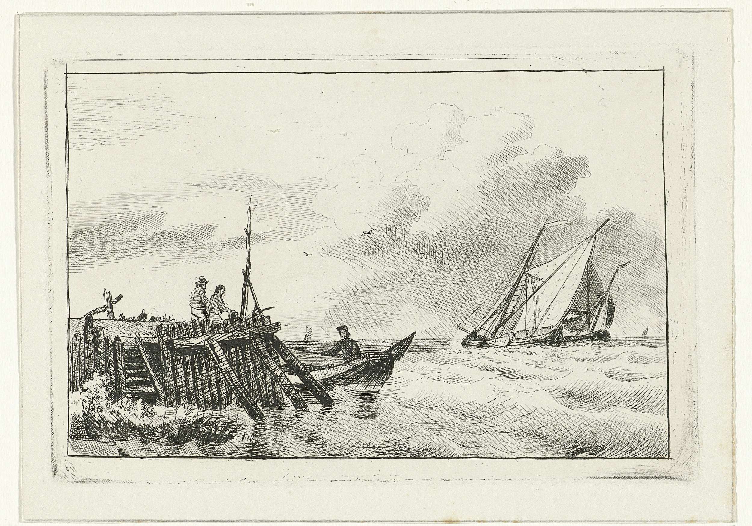 Links een pier, waarachter een man in een roeiboot. Rechts op de achtergrond twee zeilschepen.