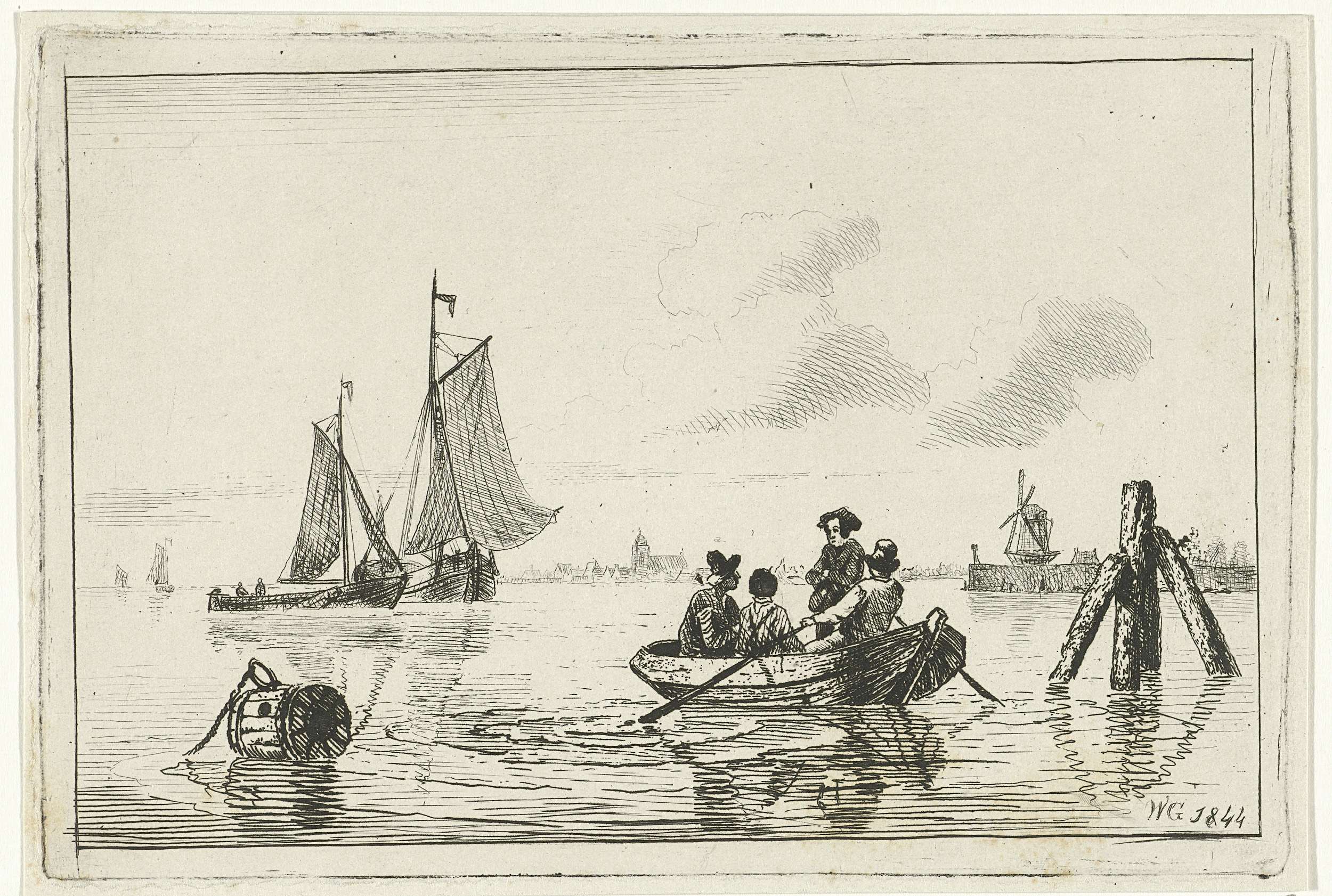 Vier mannen in een sloep. Op de voorgrond een boei; op de achtergrond een molen en zeilschepen.