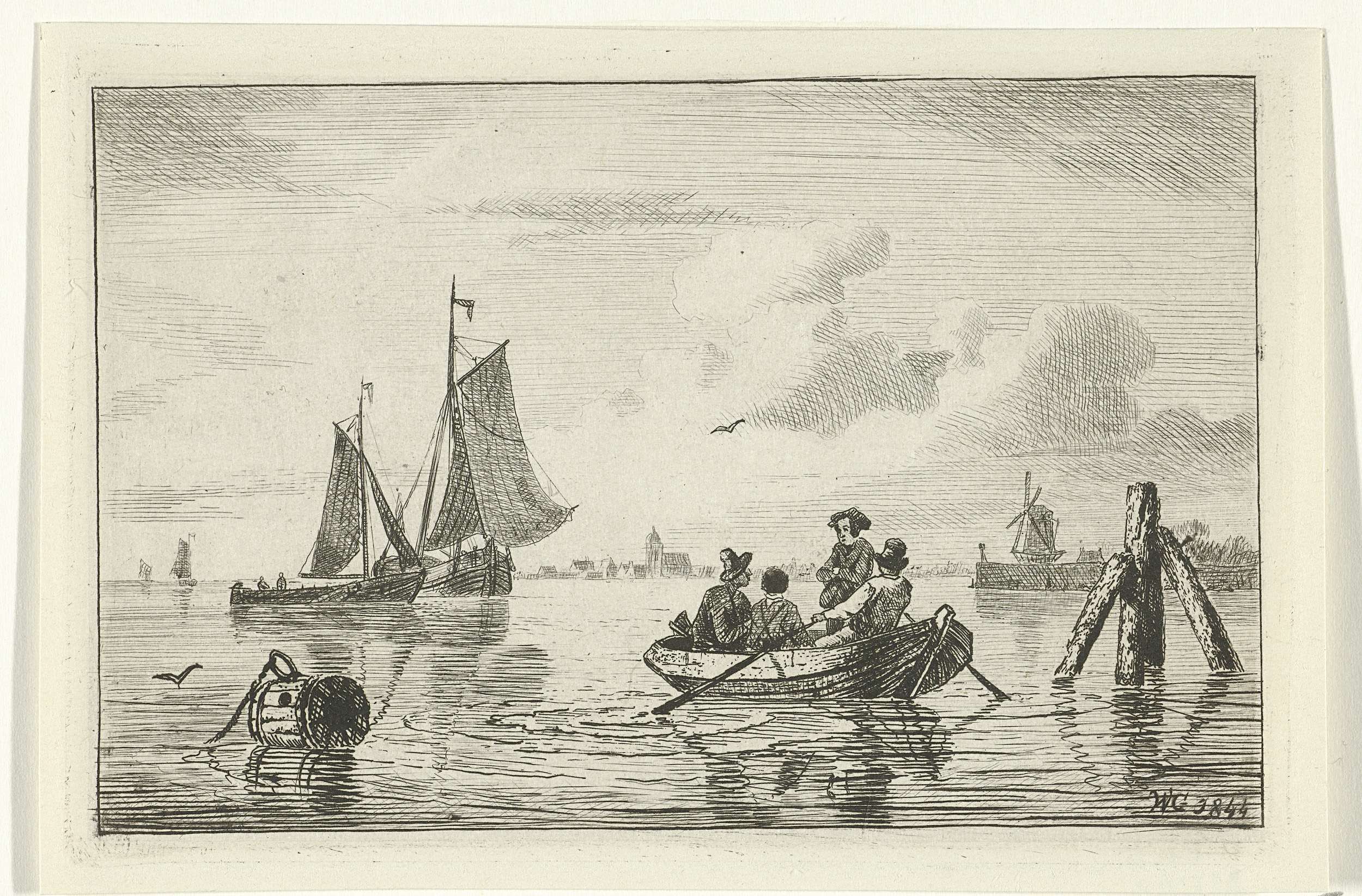 Vier mannen in een sloep. Op de voorgrond een boei; op de achtergrond een molen en zeilschepen.