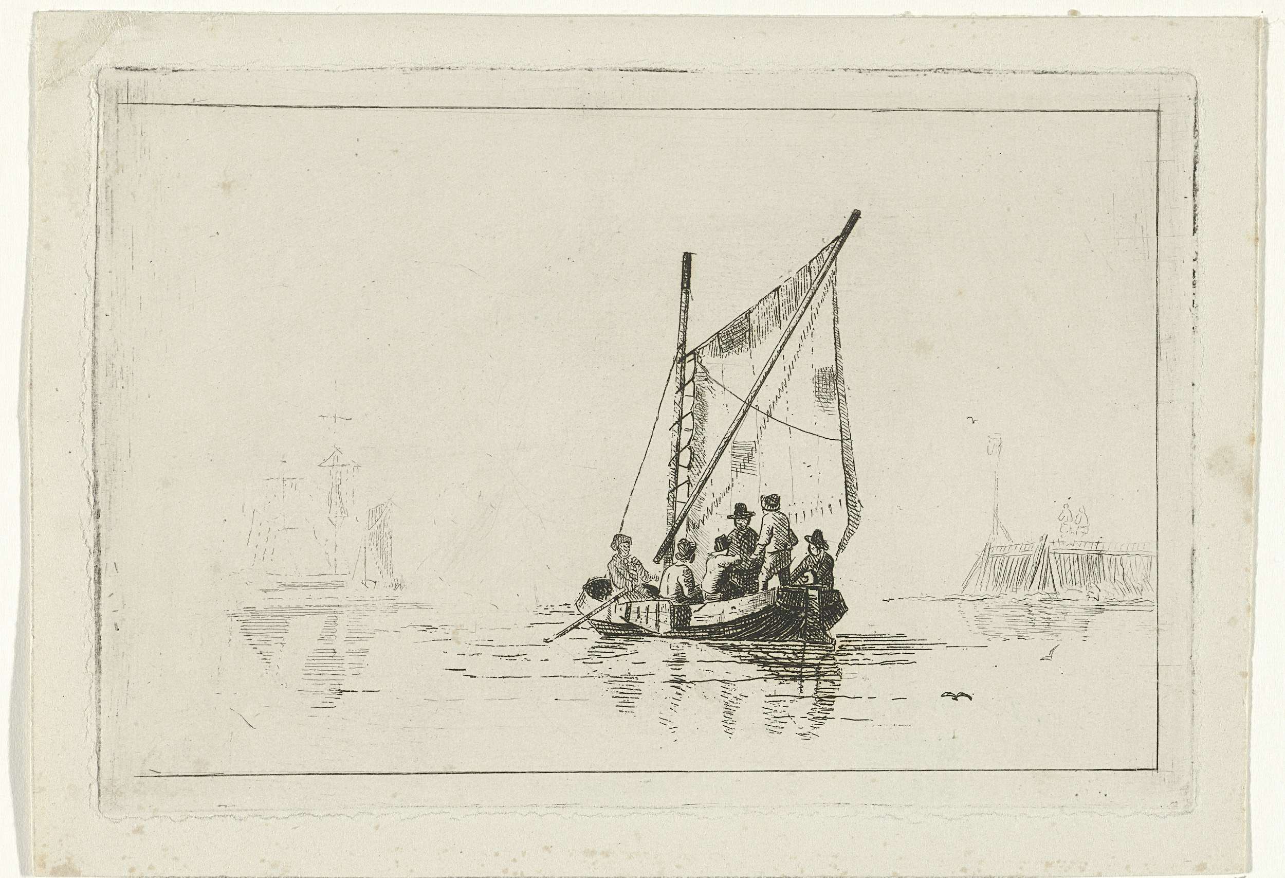 Een visserspink met zes mannen, links op de achtergrond een zeilschip, rechts een pier.